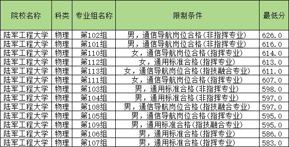 | 陆军工程大学 | 物理 | 001专业组 | 舰艇岗位合格 | 630 |