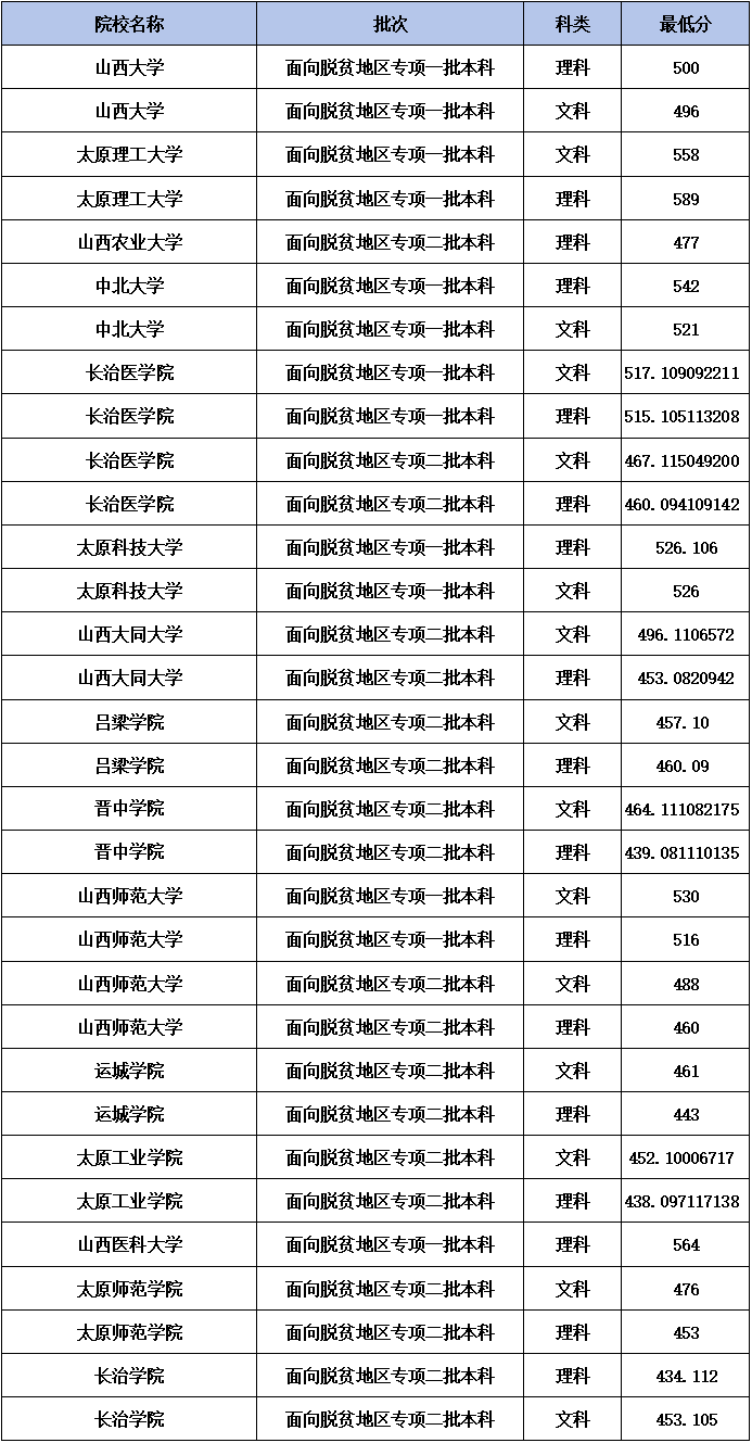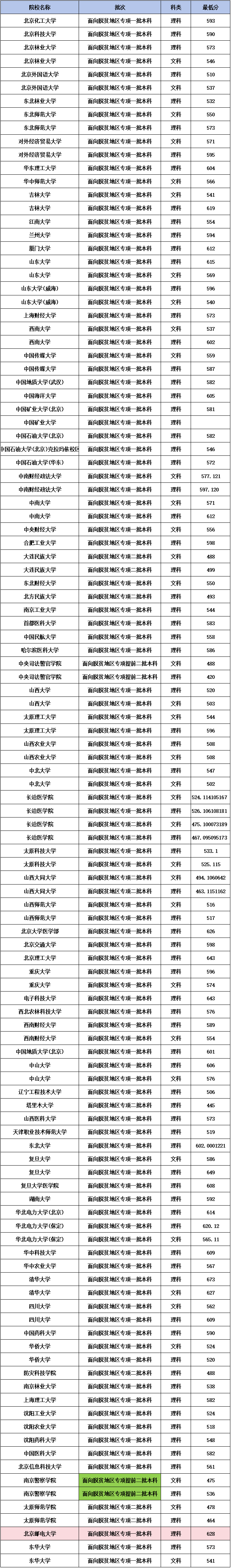 注:本文只整理出专项计划院校在山西的招生最低分,不含专业组、具体专业分数线。