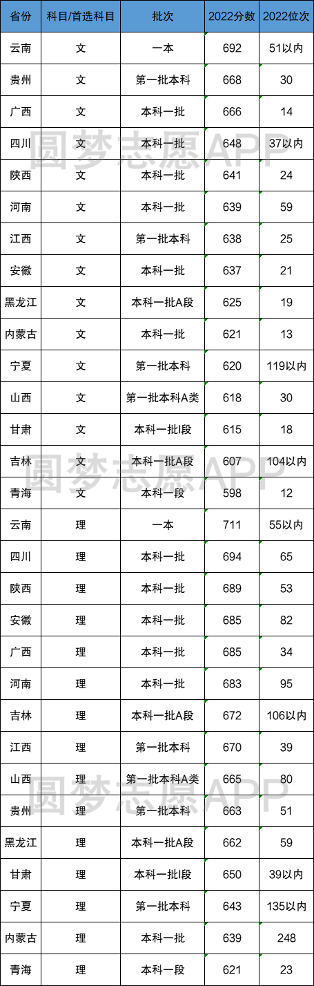 在沿用旧高考模式的15个省份中,北京大学文科录取分数线最高的是云南(692分,51名以内),录取分数线最低的是青海(598分,12名)。理科录取分数线最高的是云南(711分,55名以内),录取分数线最低的是青海(621分,23名)。