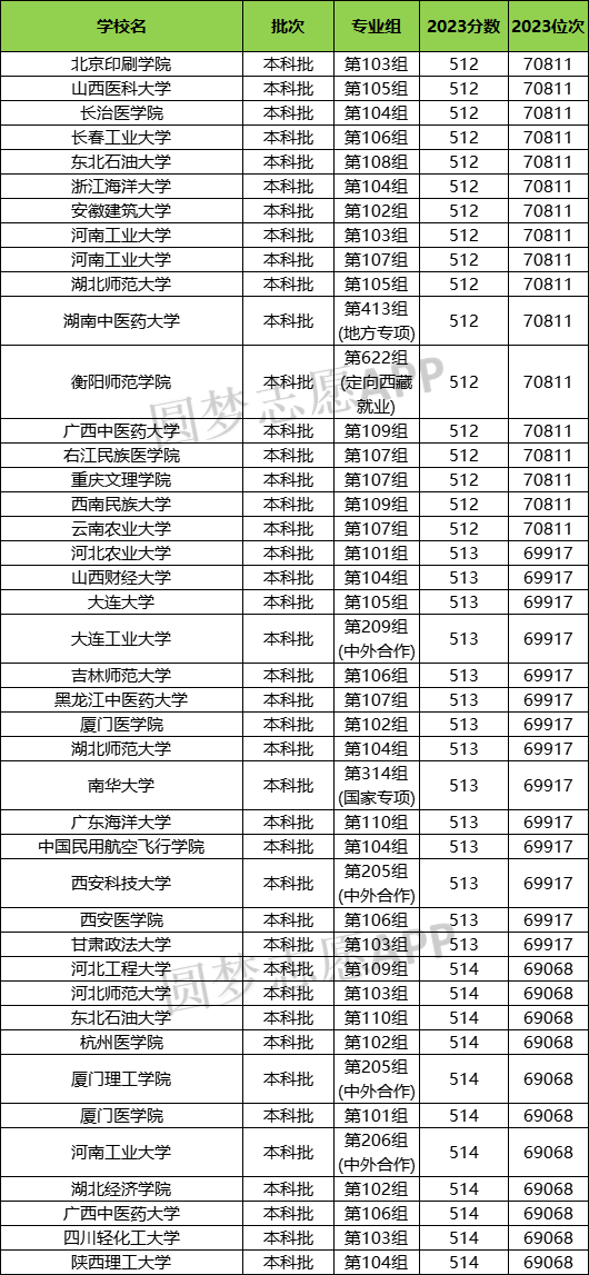 2023年湖南省物理类录取位次为7万名左右(6.9万到7.1万名)对应的分数段为512-514分,可以报考36所学校的42个专业组,其中36所公办。