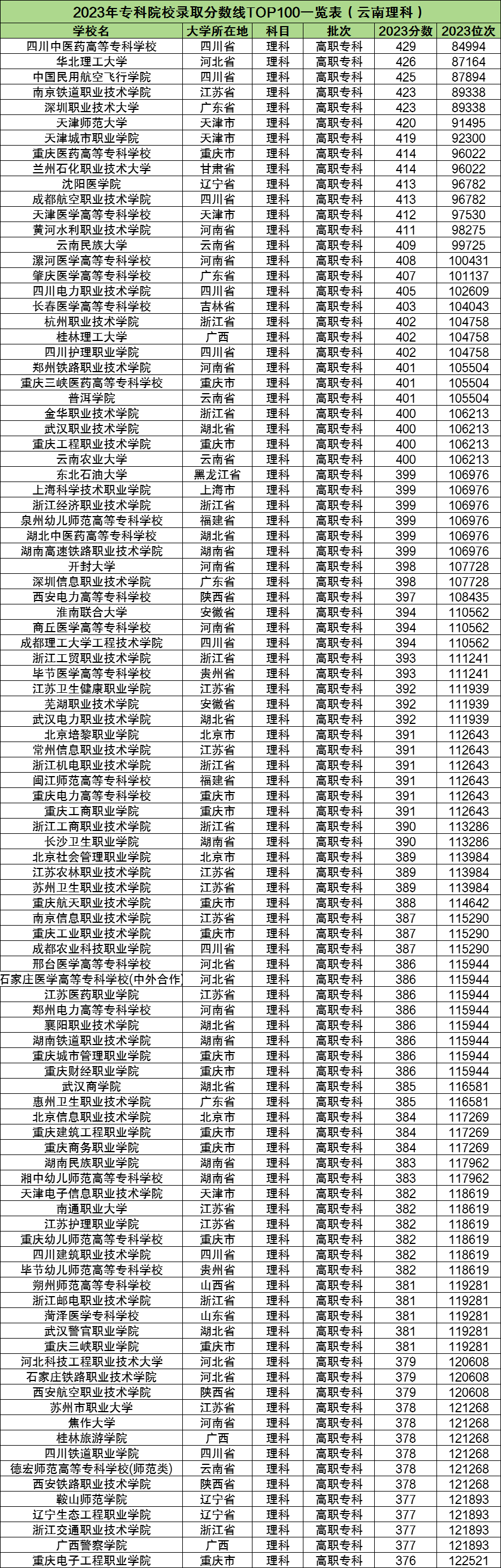 以下是2023年专科院校在云南省理科的录取分数线TOP100一览表: