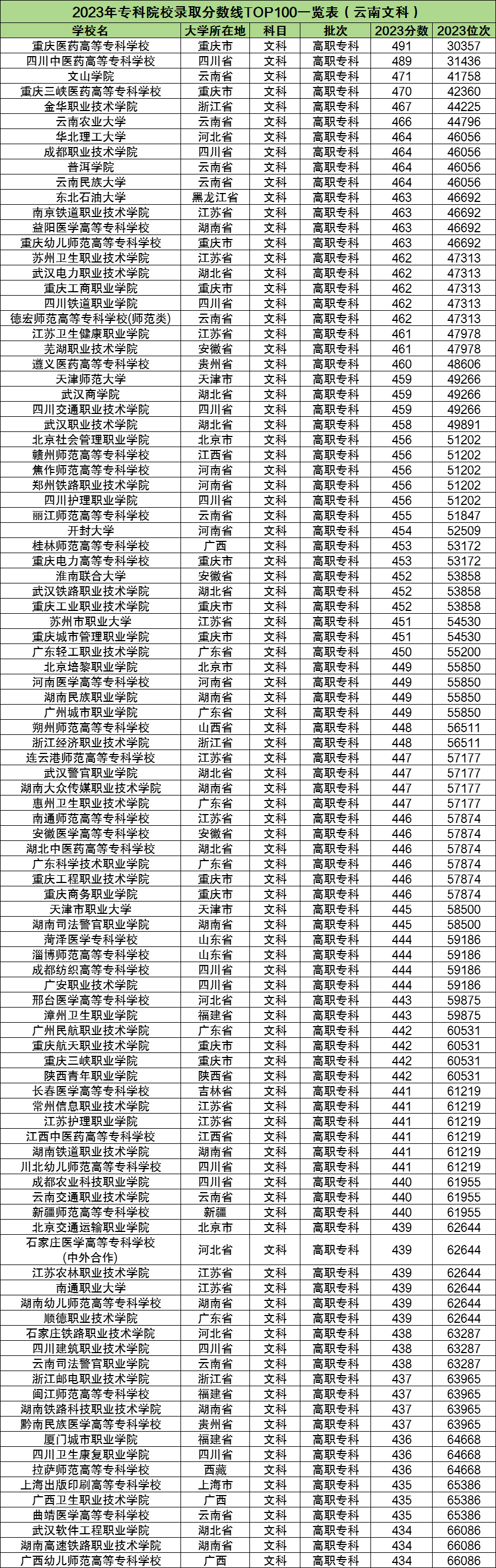 以下是2023年专科院校在云南省文科的录取分数线TOP100一览表: