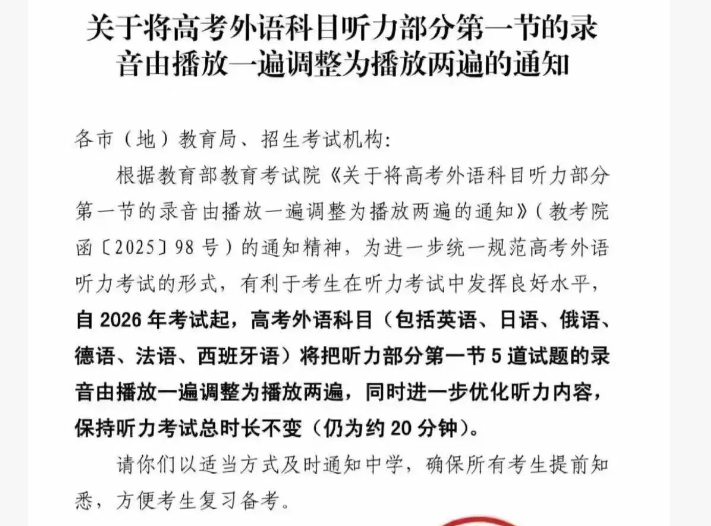 根据教育部教育考试院发布的《关于将高考外语科目听力部分第一节的录音由播放一遍调整为播放两遍的通知》(教考院函[2025]98号),2026年高考外语听力考试将有明显调整。