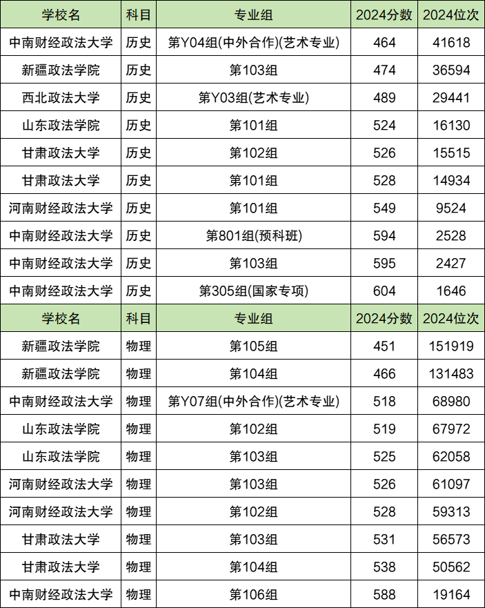 2024年湖南政法大学最低分数线历史组是464分,物理组是451分,对比湖南当年本科线可发现:首选历史科目的考生最低超过本科线26分即可、首选物理科目的考生最低超过本科线29分即可有机会上政法大学。