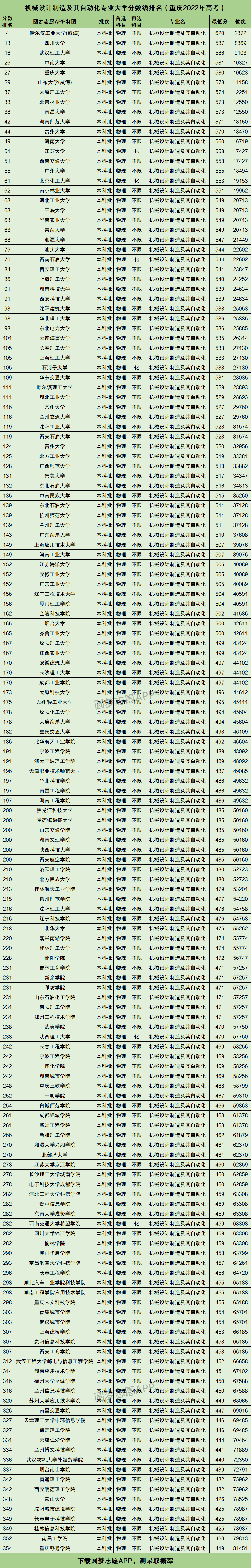 以上这10所大学的机械设计制造及其自动化专业2022年在重庆市招生时,物理类录取分数线排名前十,具体收分范围为571分至620分。