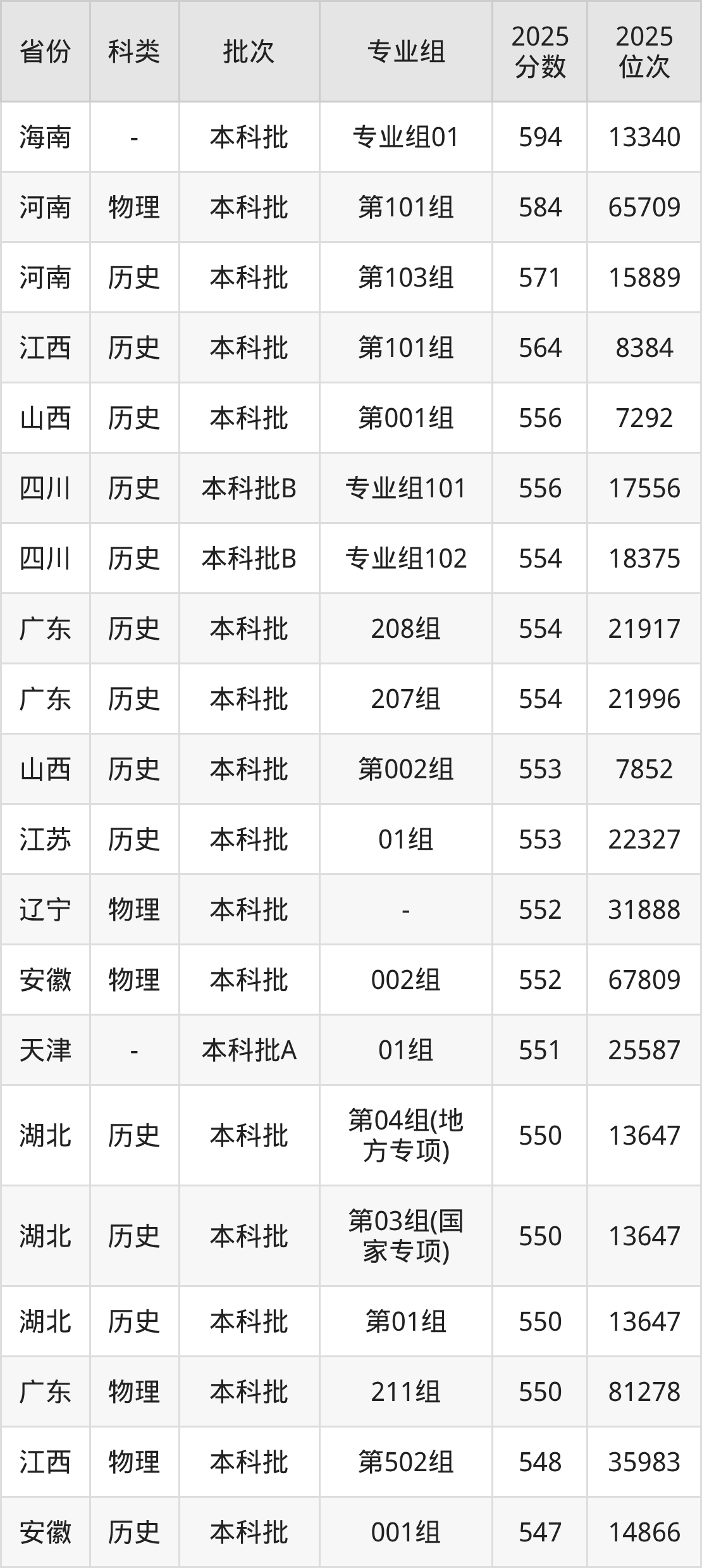 历史类第101组:最低分为548分、位次是10907名