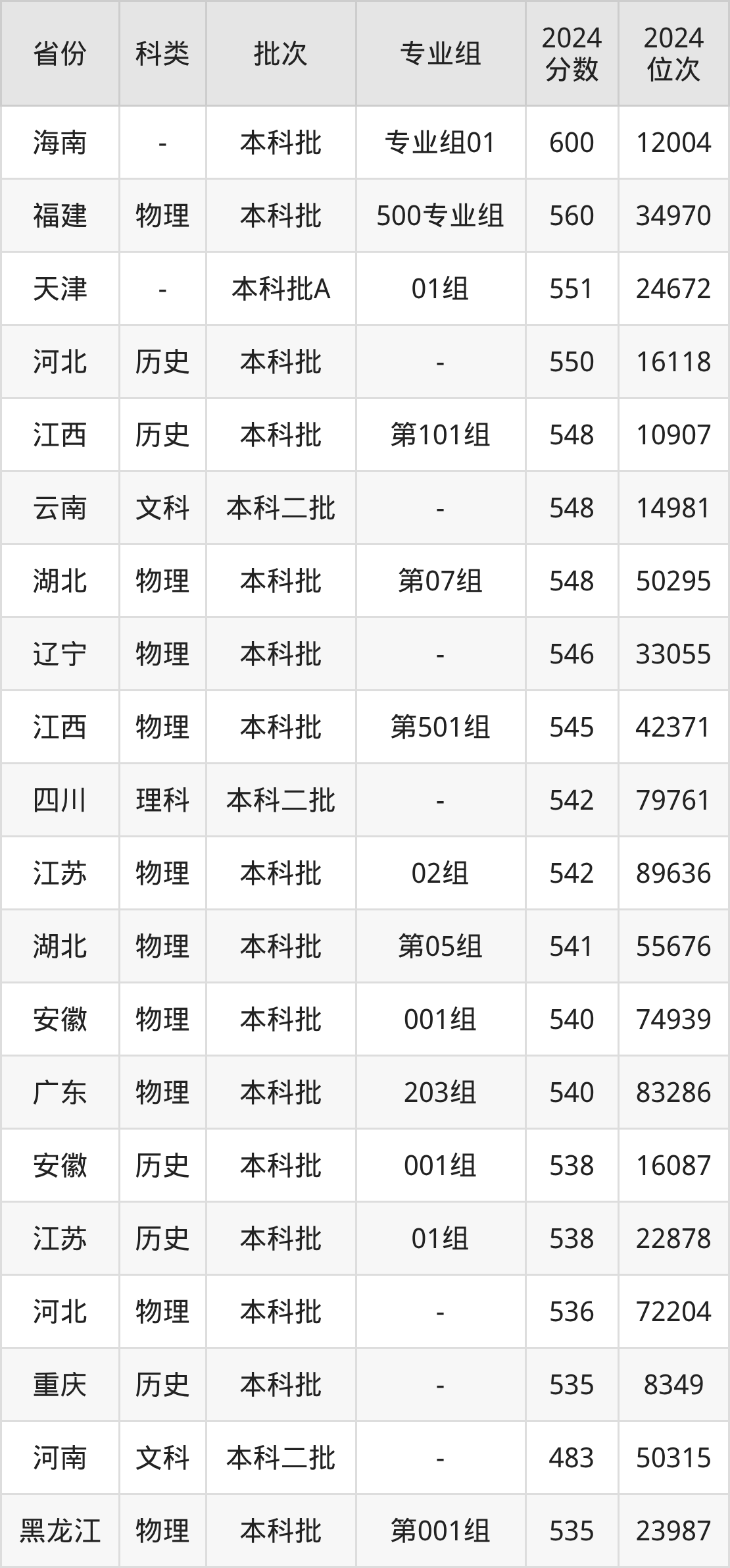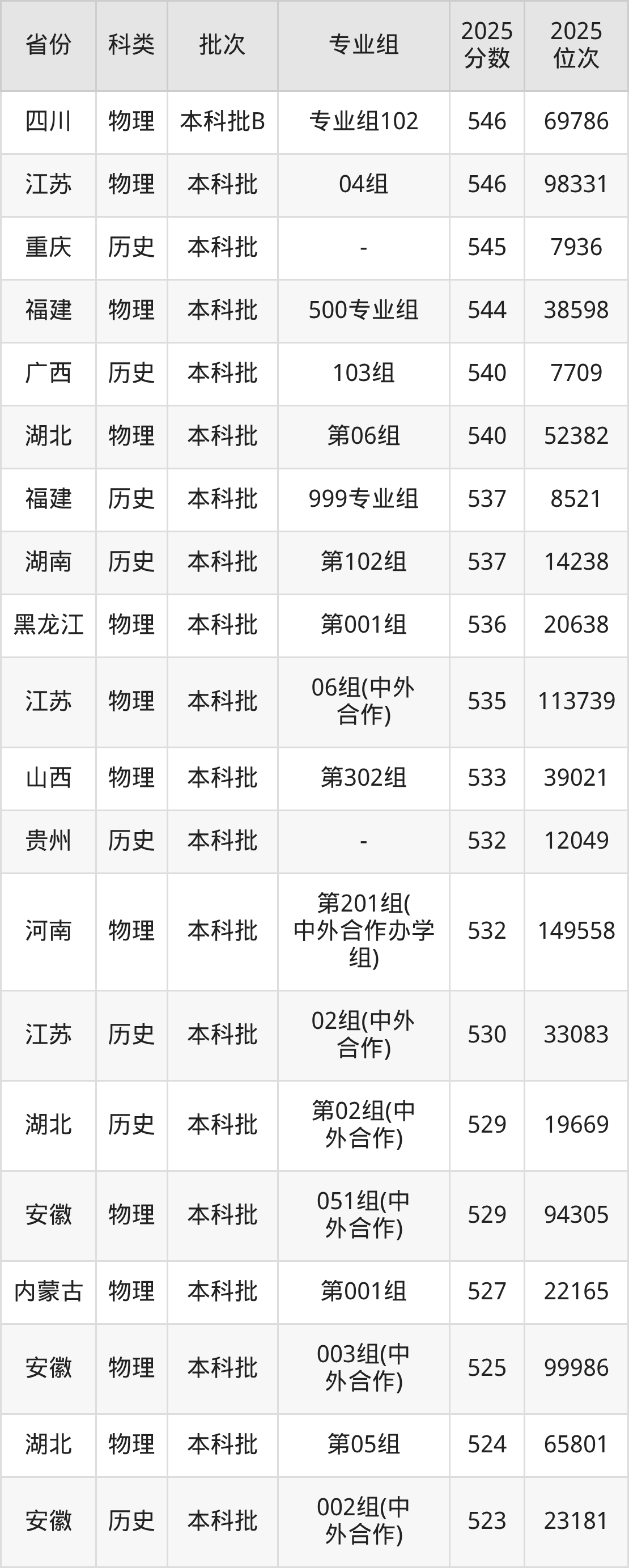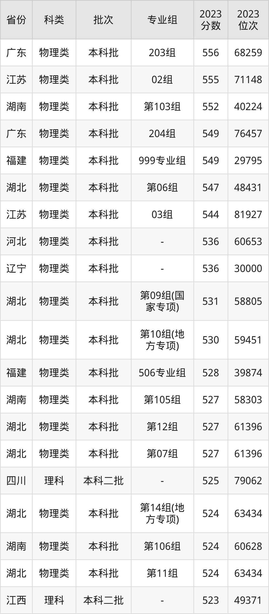 物理类第001组:最低分为535分、位次是23987名