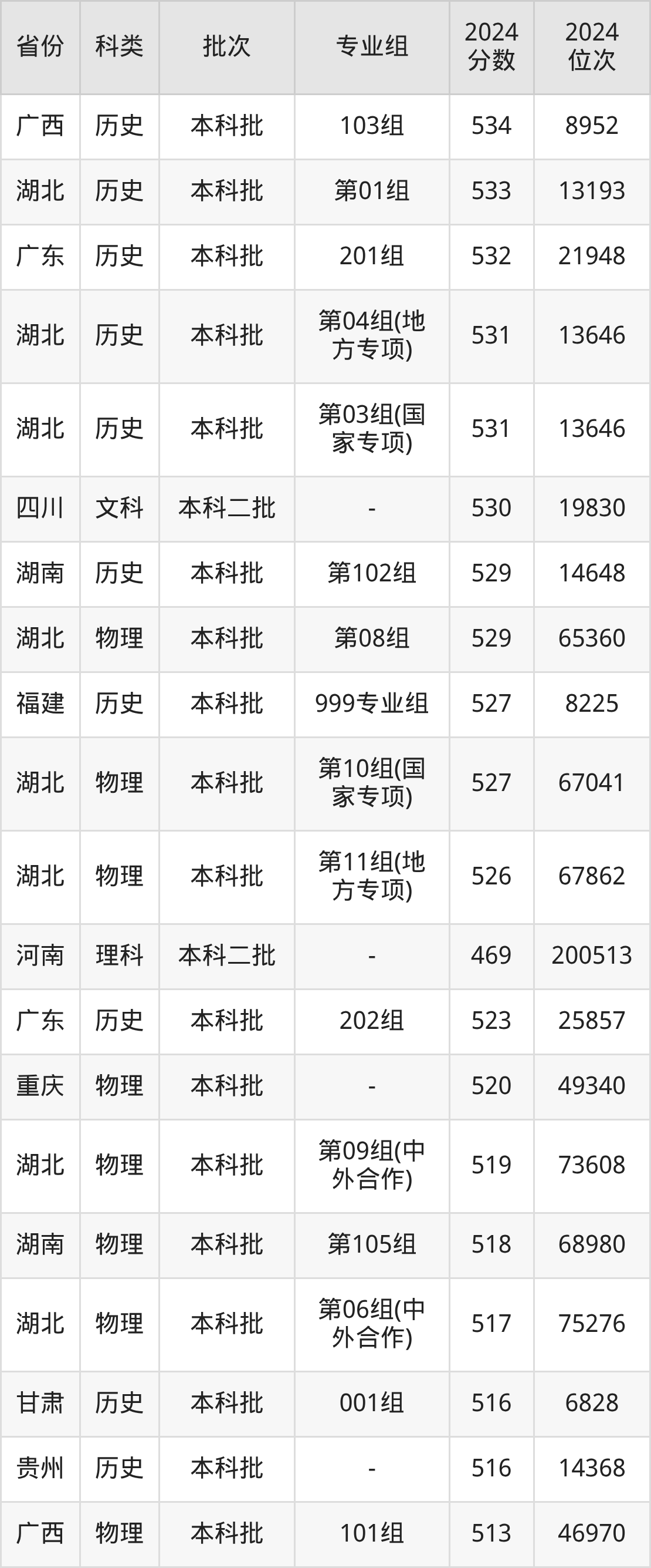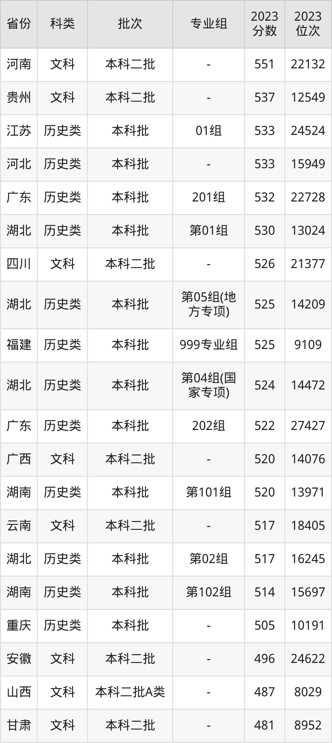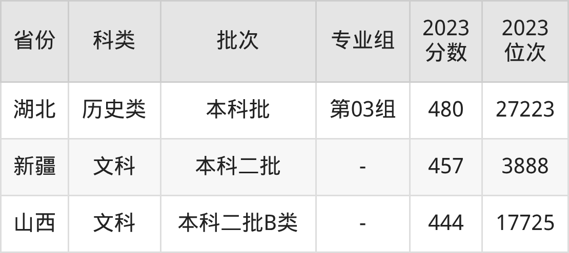 在文科/历史类方面,学校在河南、贵州、江苏等地招收本科生。从下图可看到,学校在湖北历史类本科最低分要求比物理类要低,差值为26分。分数详情可直接见下表: