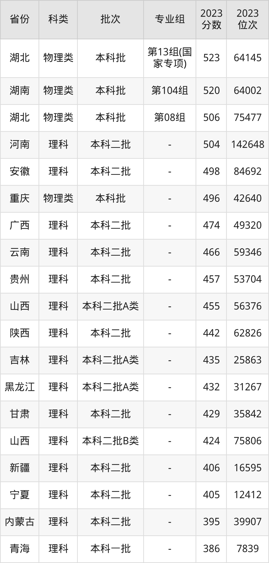 物理类002组:最低分为503分、位次是32123名