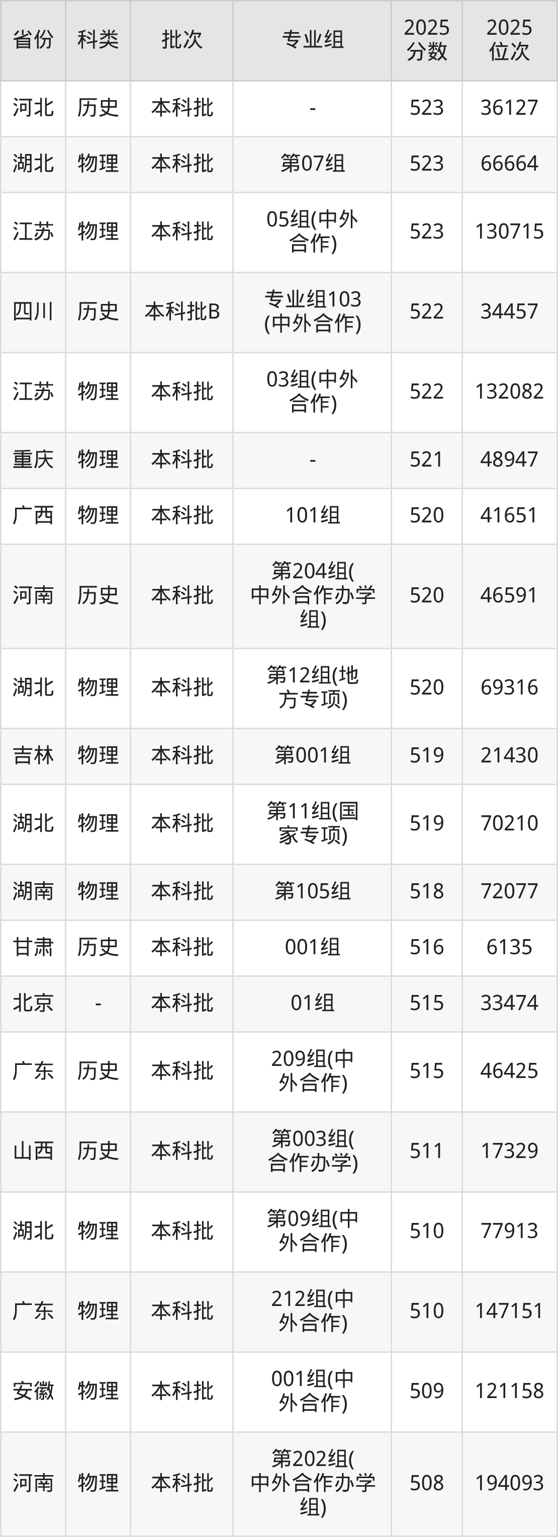历史类303组(中外合作):最低分为466分、位次是25678名