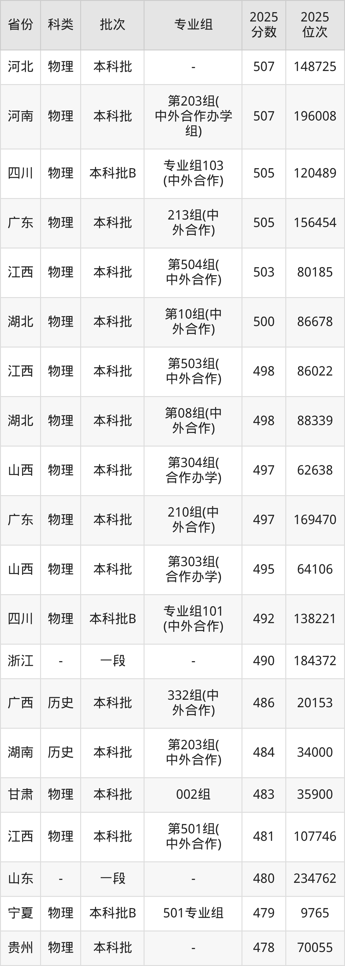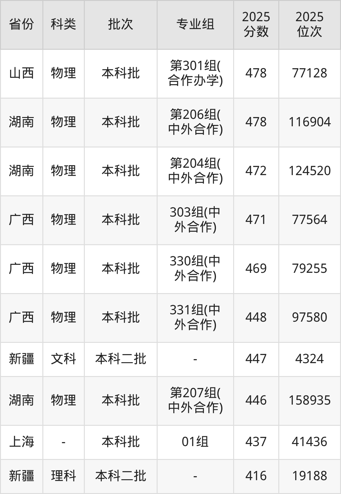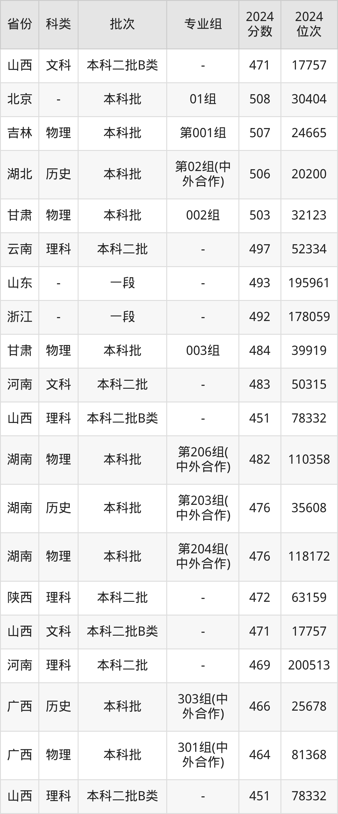 物理类301组(中外合作):最低分为464分、位次是81368名