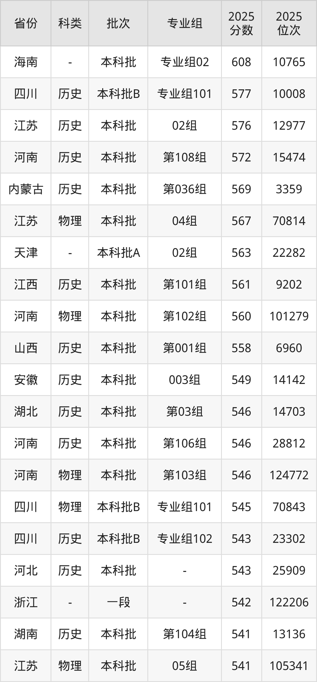历史类:最低分508分、位次18983位