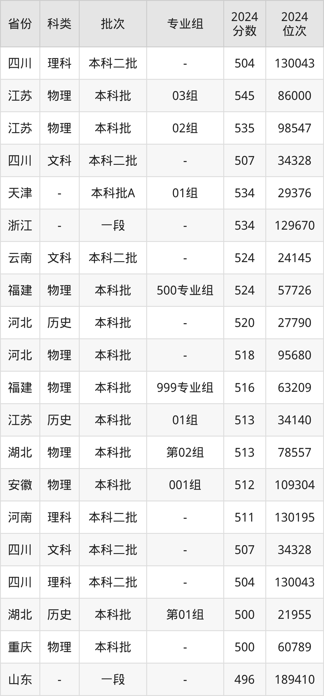 物理类500专业组:最低分为524分、位次是57726名