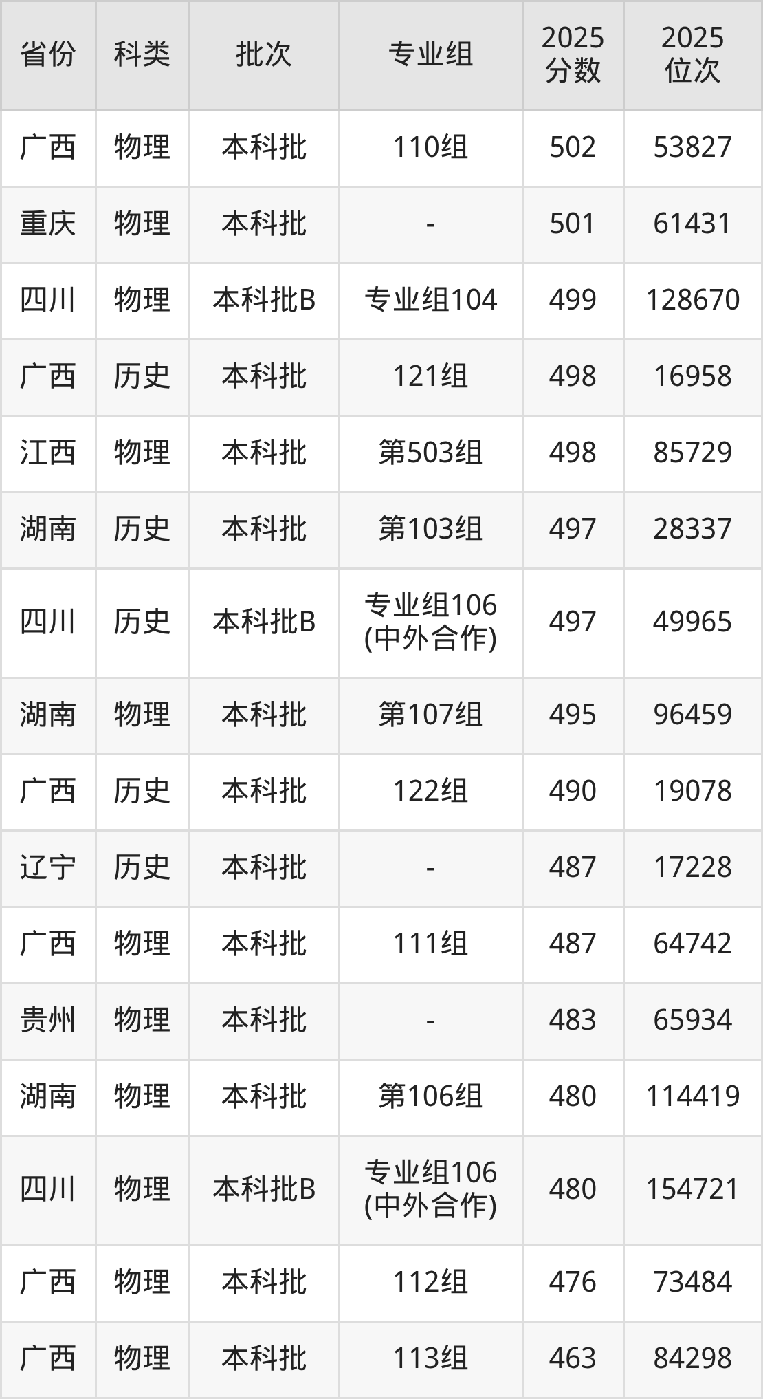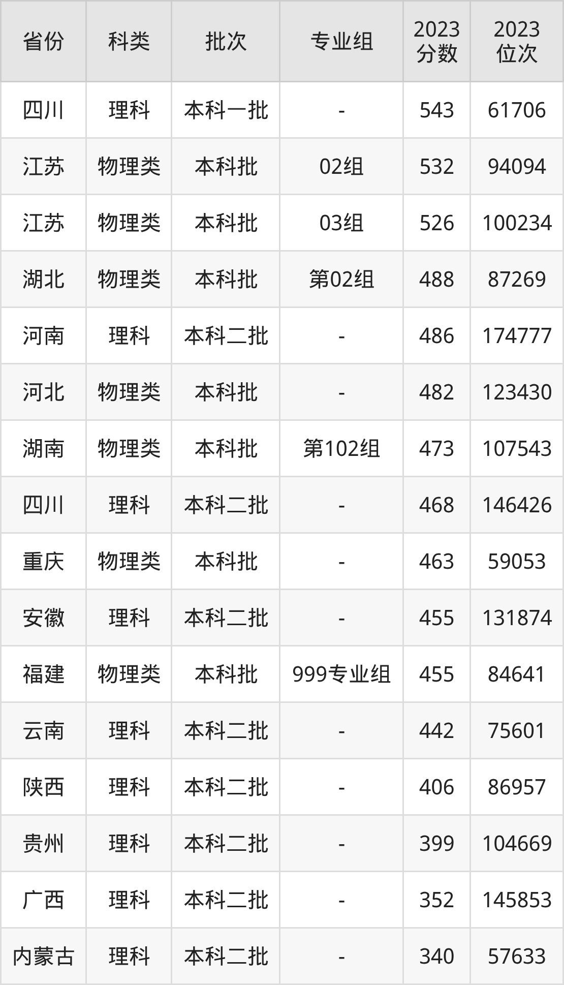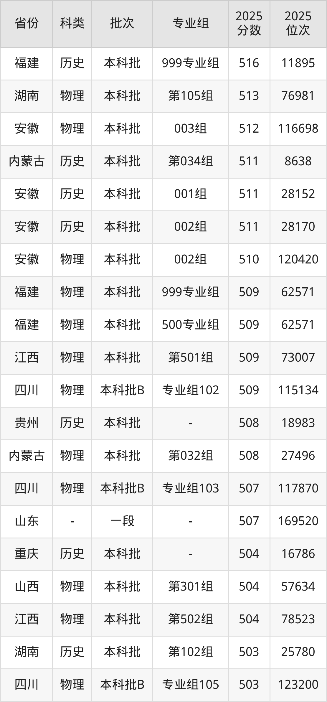 物理类151组:最低分为489分、位次是63648名