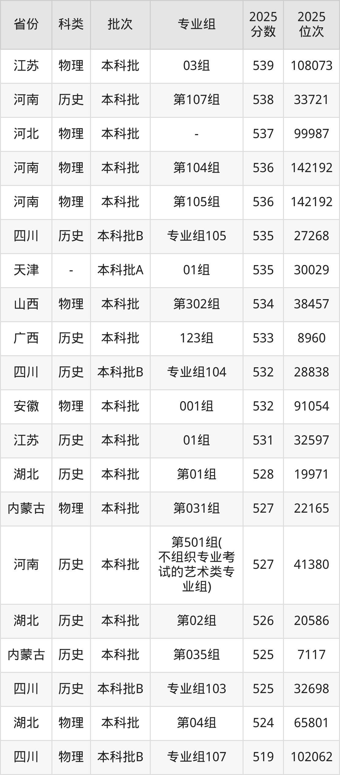 历史类001组:最低分为485分、位次是35350名