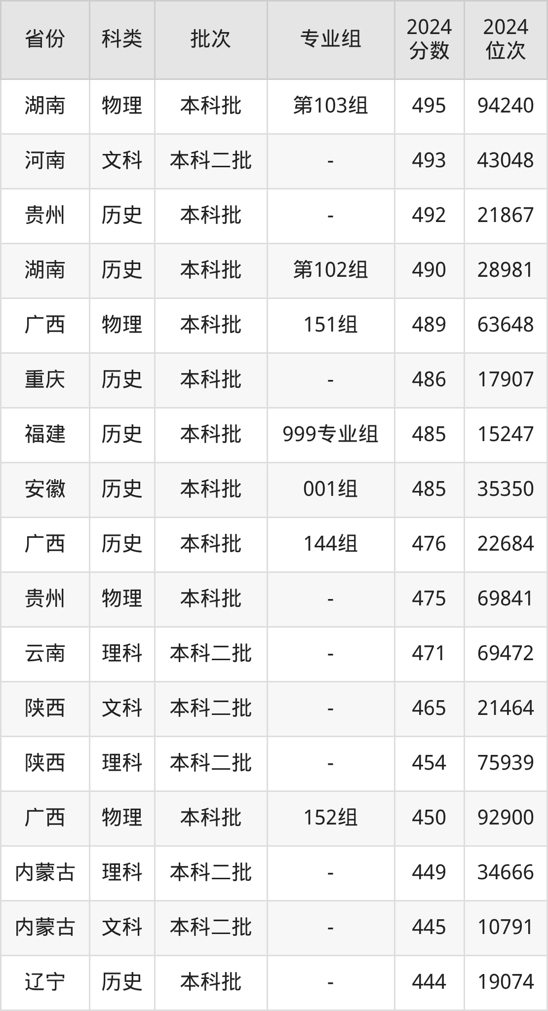 物理类第103组:最低分为495分、位次是94240名