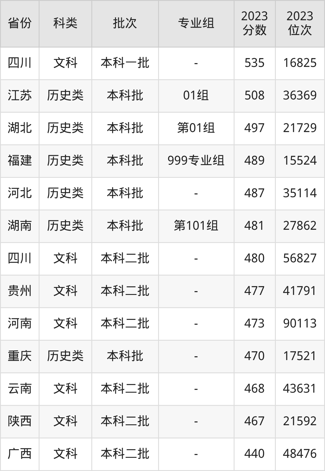 在文科/历史类方面,学校在四川、江苏、湖北等地招收本科生。从下图可看到,学校在四川文科本科最低分要求比理科要高,差值为12分。分数详情可直接见下表: