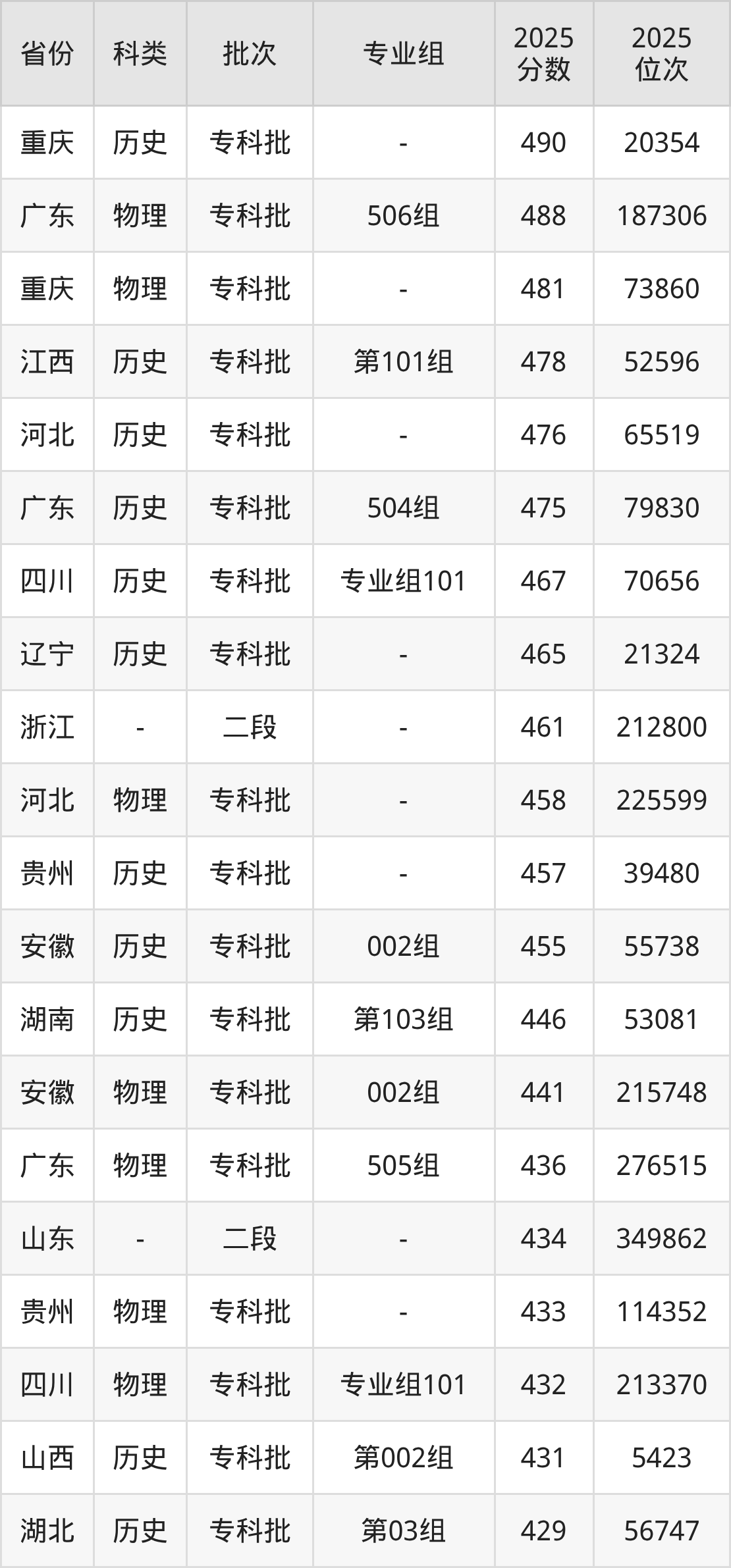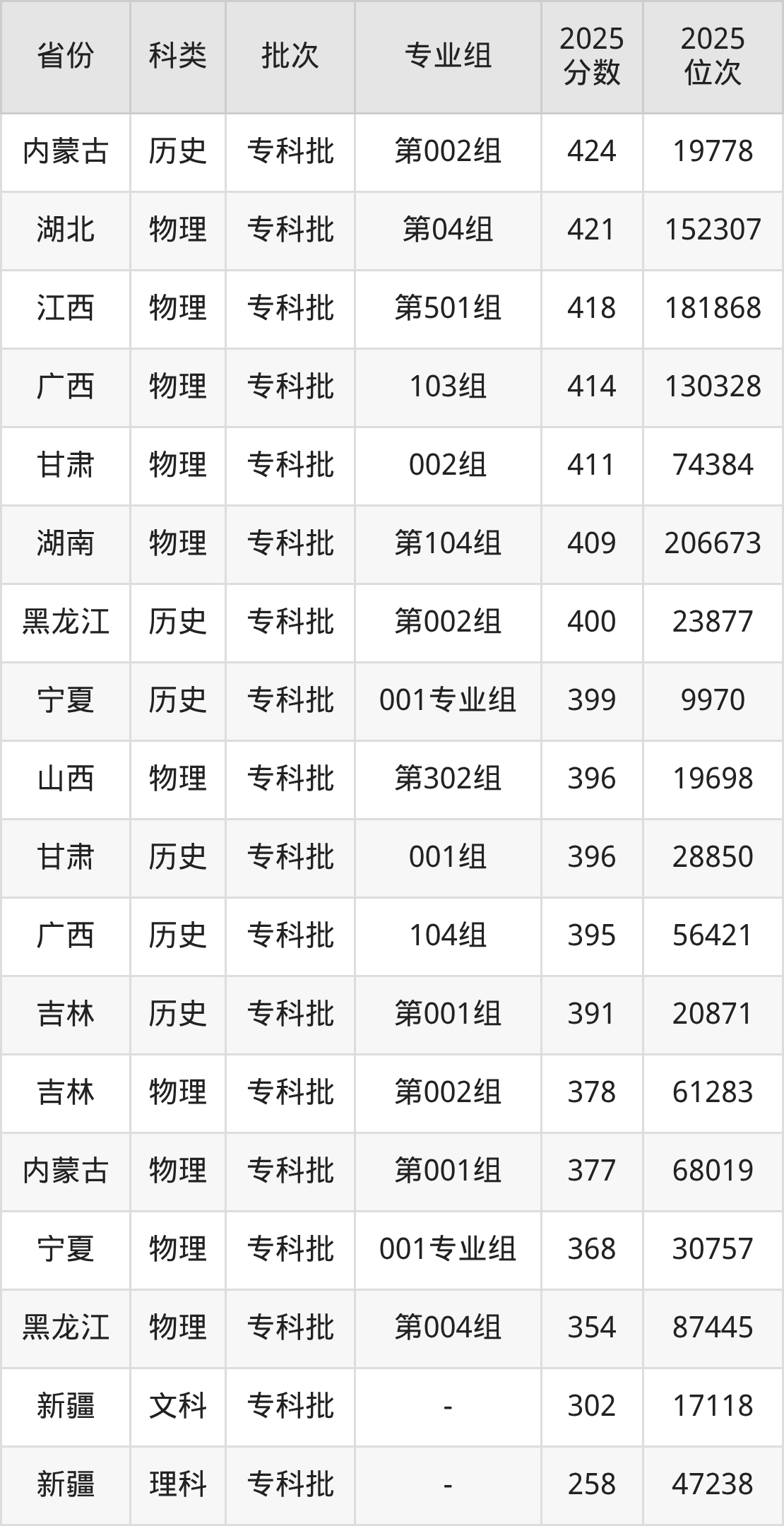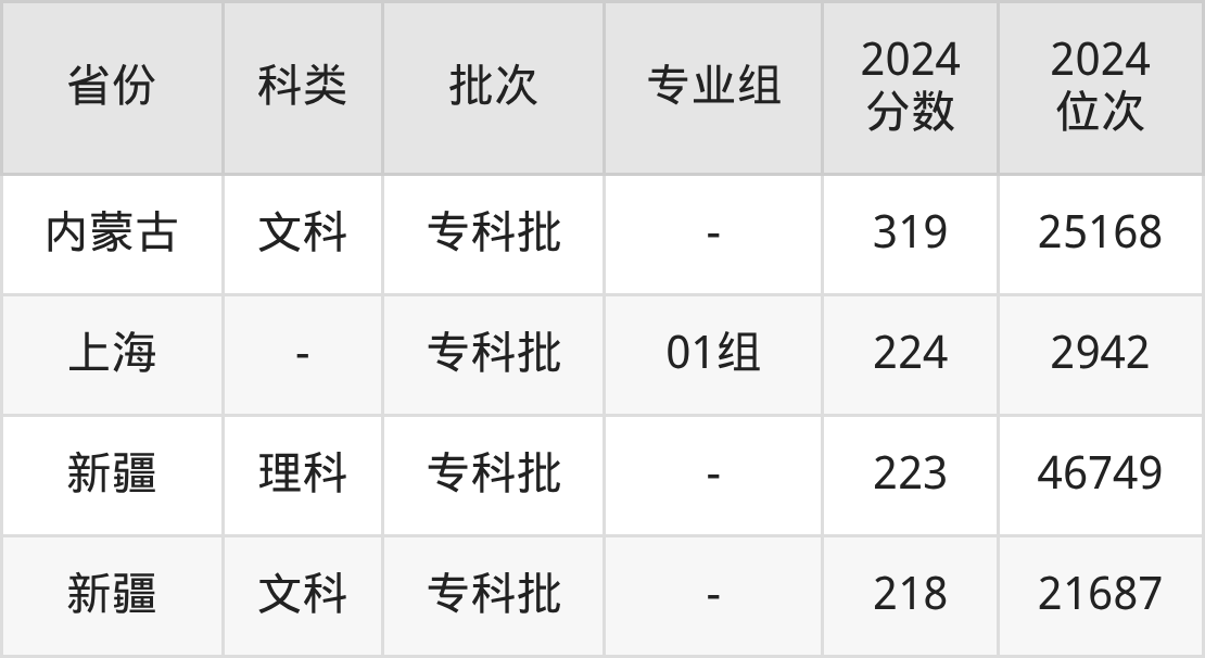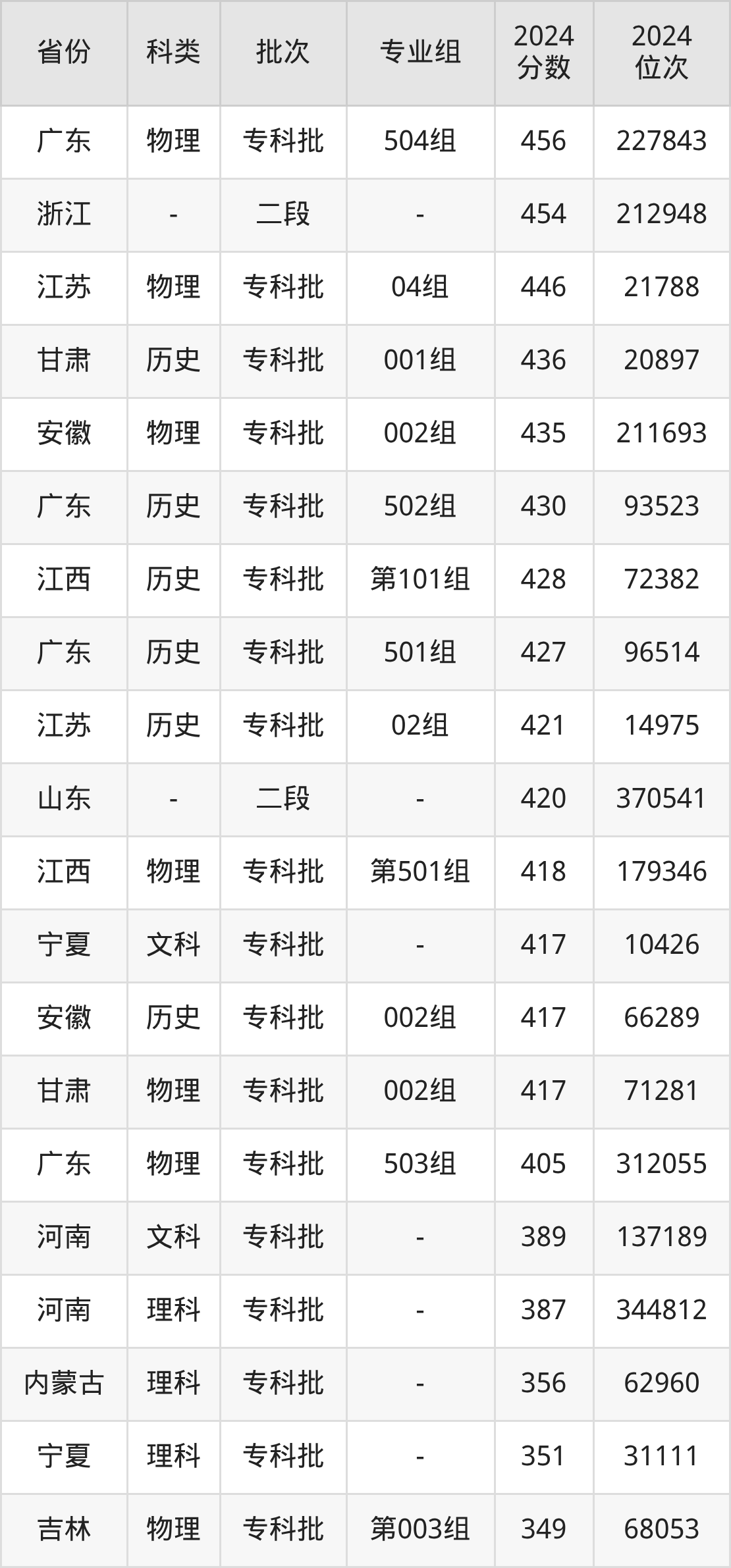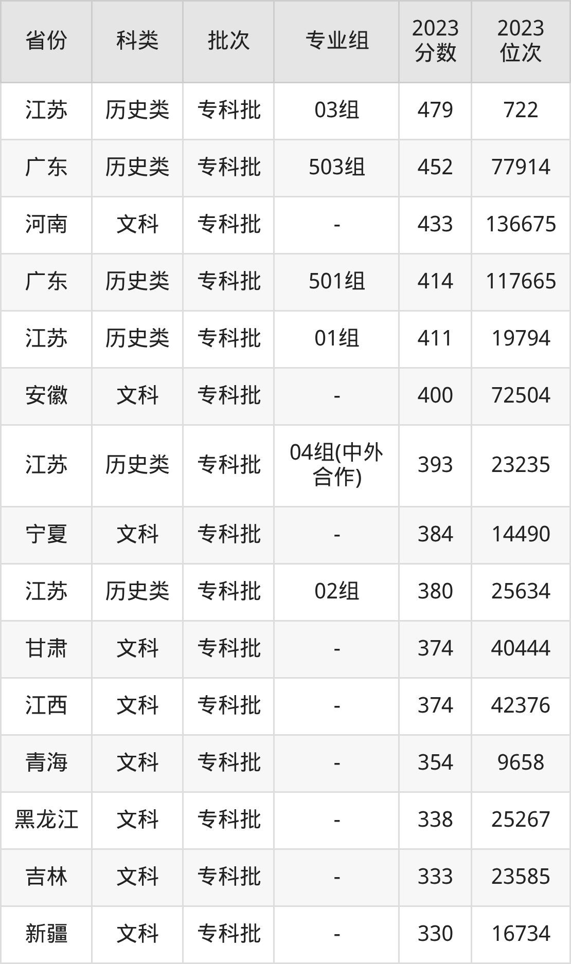 在历史类/文科方面,学校在江苏、广东、河南等地招收专科生。从下图可看到,学校在江苏历史类专科最低分要求比物理类要低,差值为41分。分数详情可直接见下表: