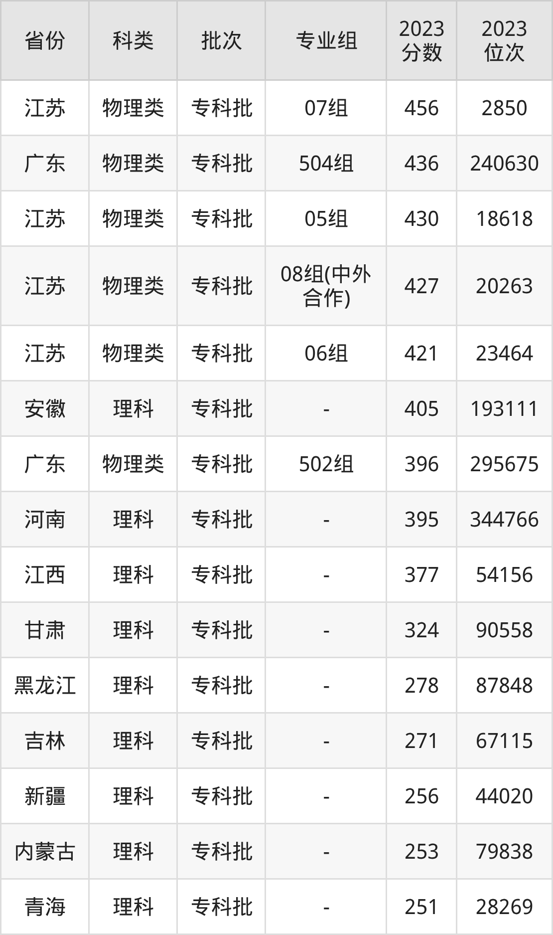 从学校专科专业在各省的录取线来看,江苏、广东等地分数最好要超过专科线216分左右。下面是江苏海事职业技术学院2023年物理类/理科录取分数线一览表:
