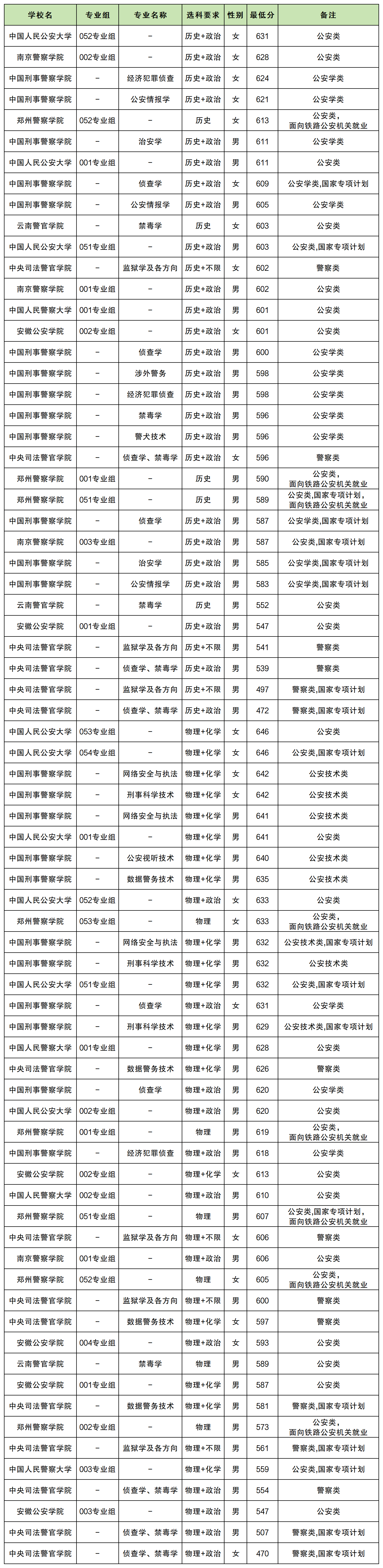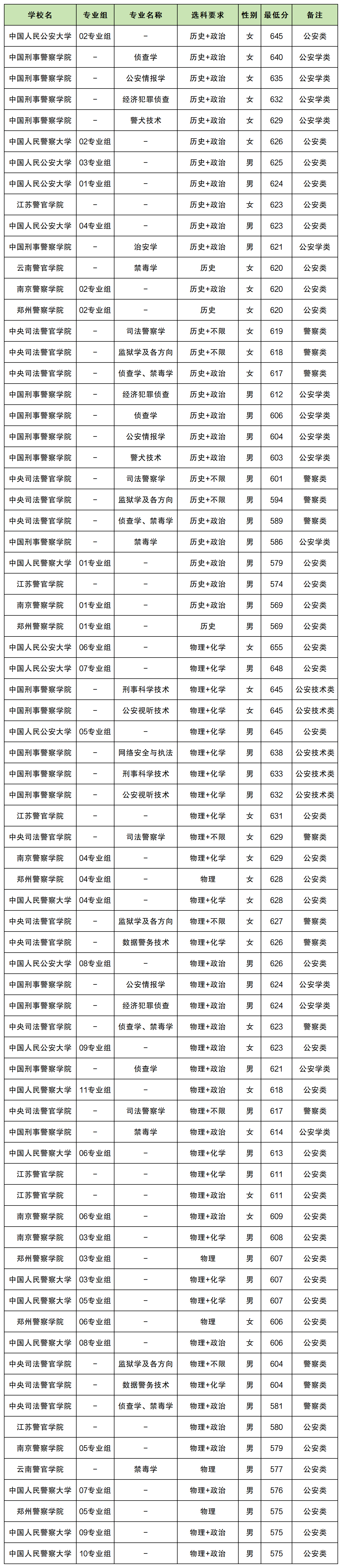 历史类分数线最高的警校是中国人民公安大学(02组,女),2025年分数线是645分;分数线最低的警校是郑州警察学院(01组,男)、南京警察学院(01组,男),2025年分数线均为569分。