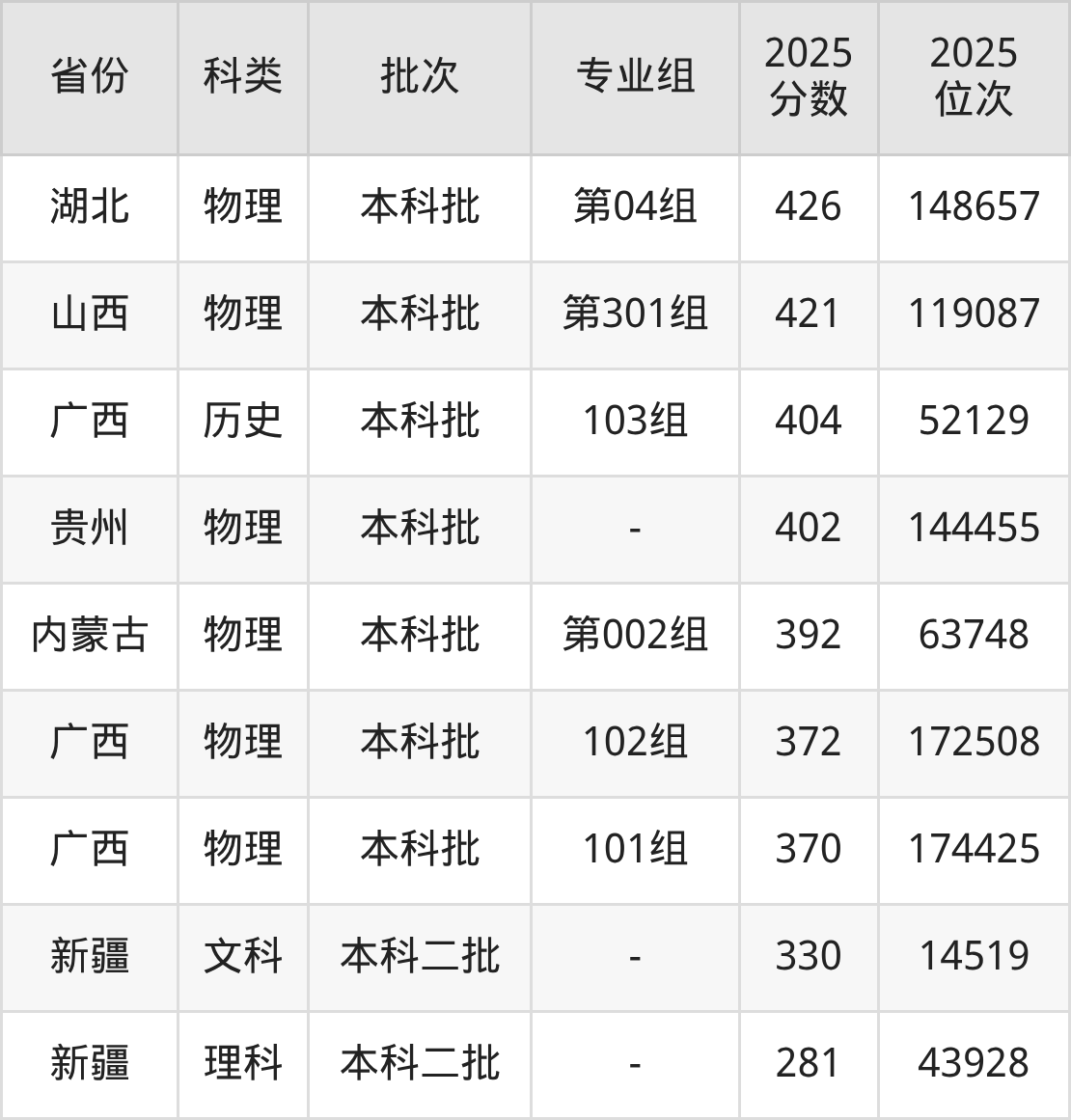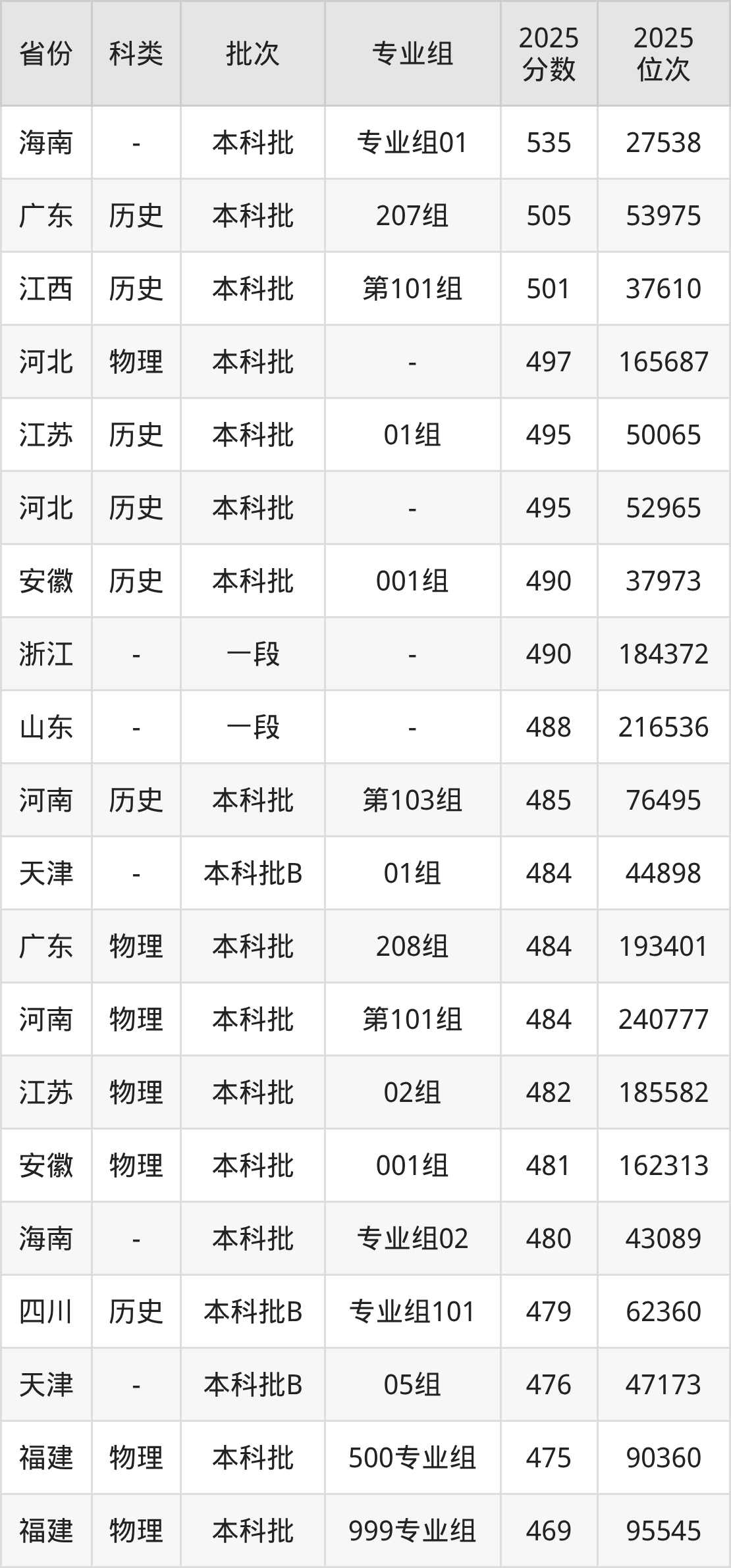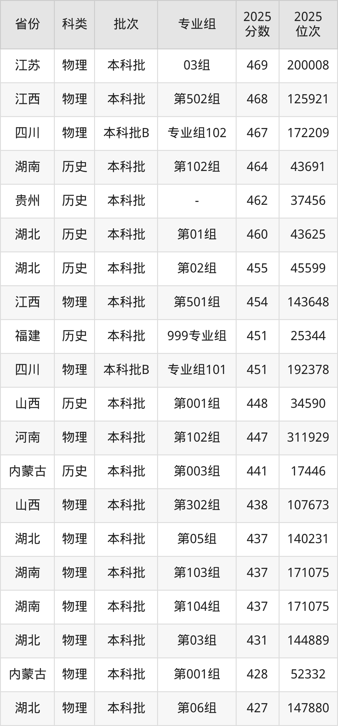 | 科类 | 专业组 | 2025 分数 | 2025 位次 |