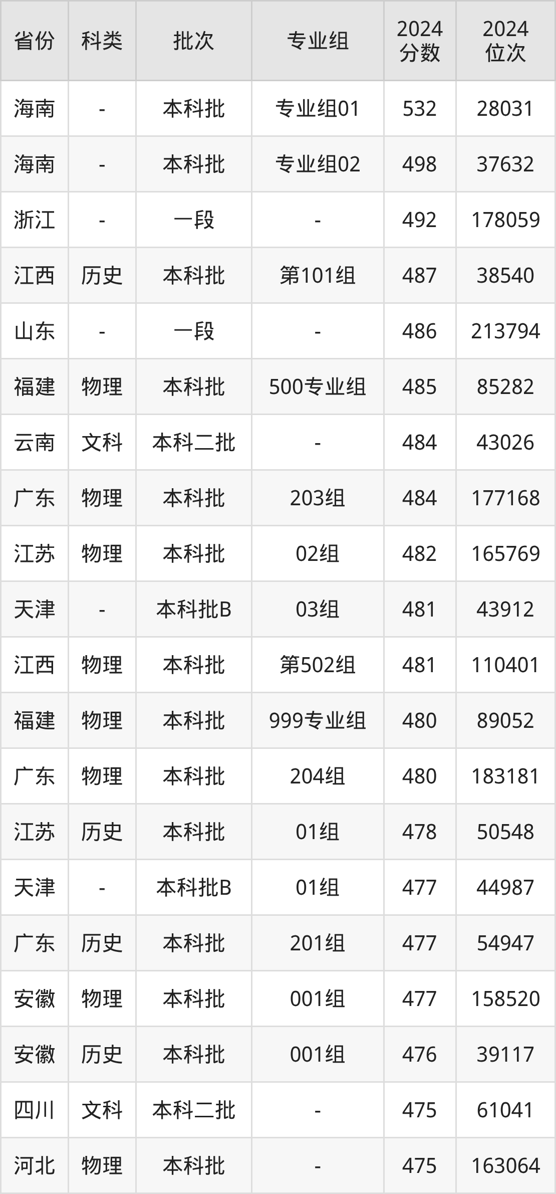 物理类001组:最低分为477分、位次是158520名