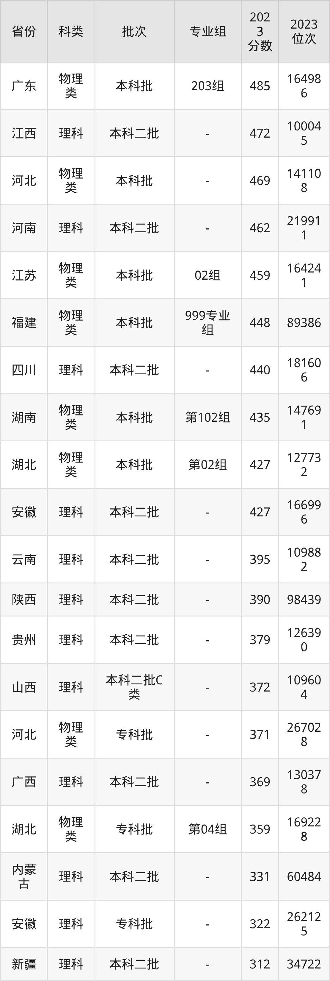 物理类03组:最低分为463分、位次是186047名
