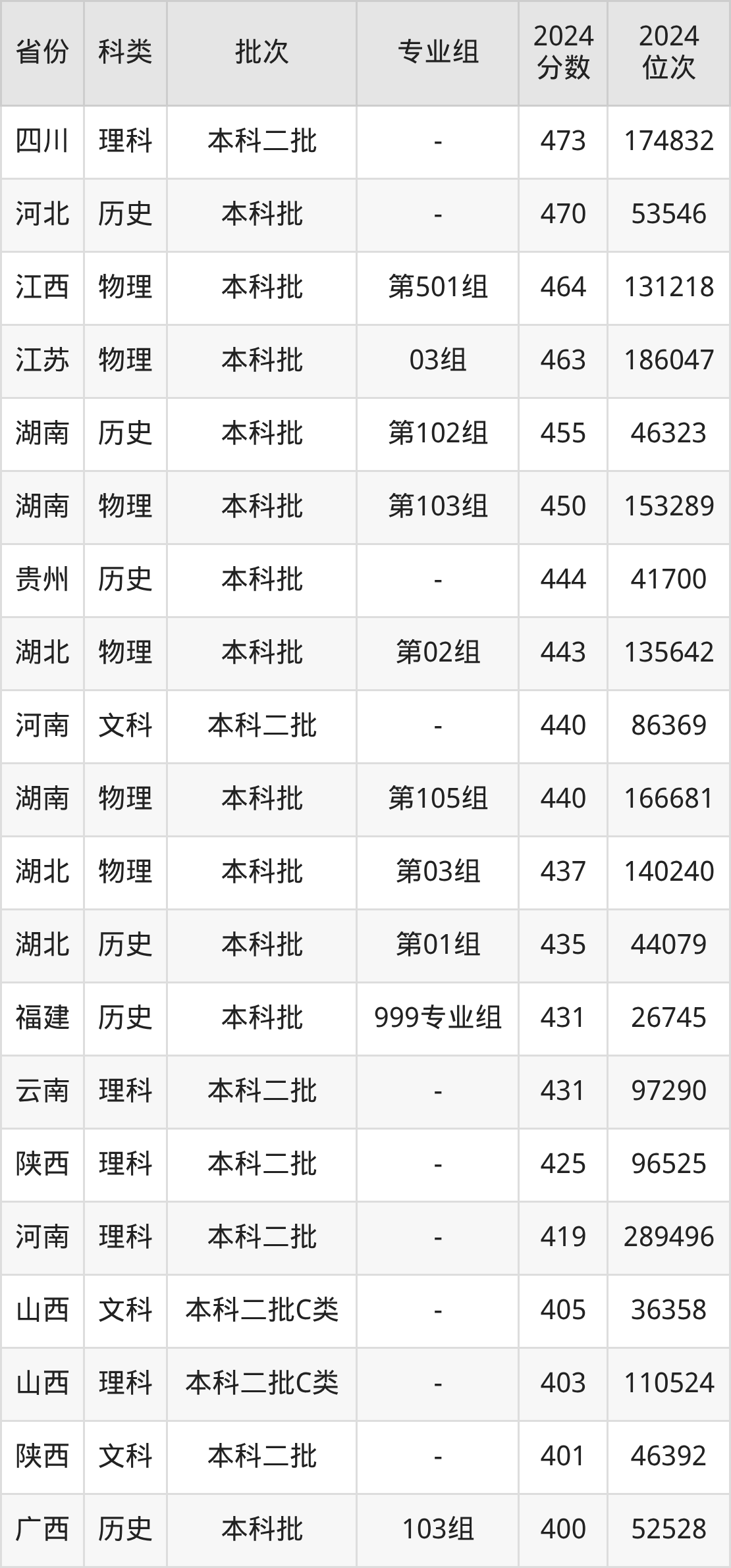 历史类103组:最低分为400分、位次是52528名