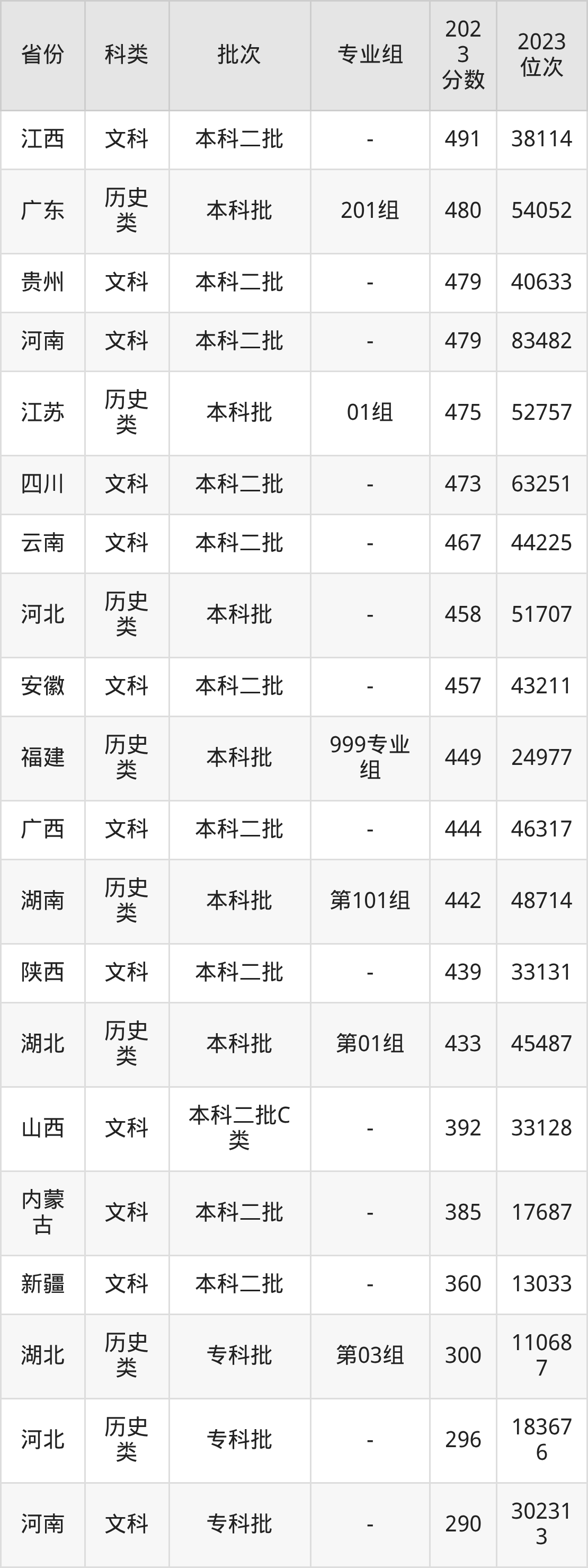 历史类201组:最低分为477分、位次是54947名