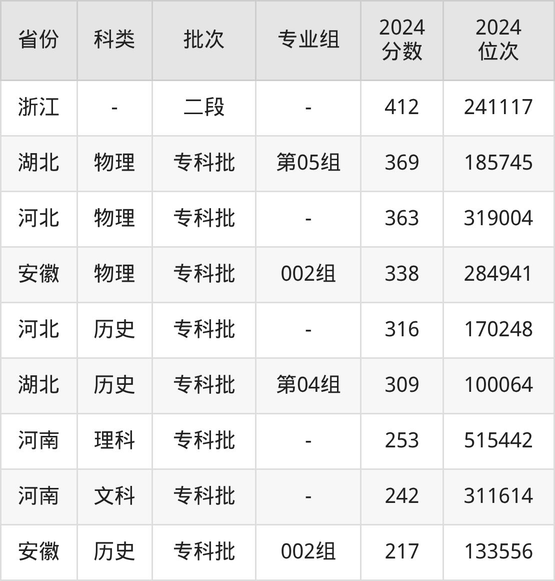 武汉晴川学院2024年专科录取分数线为217分到412分之间,省内招生最低分为309分(历史类第04组),对应最低位次为100064名,即湖北考生分数至少要在专科线上109分才能被录取。而省外招生最低分为217分(安徽历史类002组),对应最低位次为133556名。