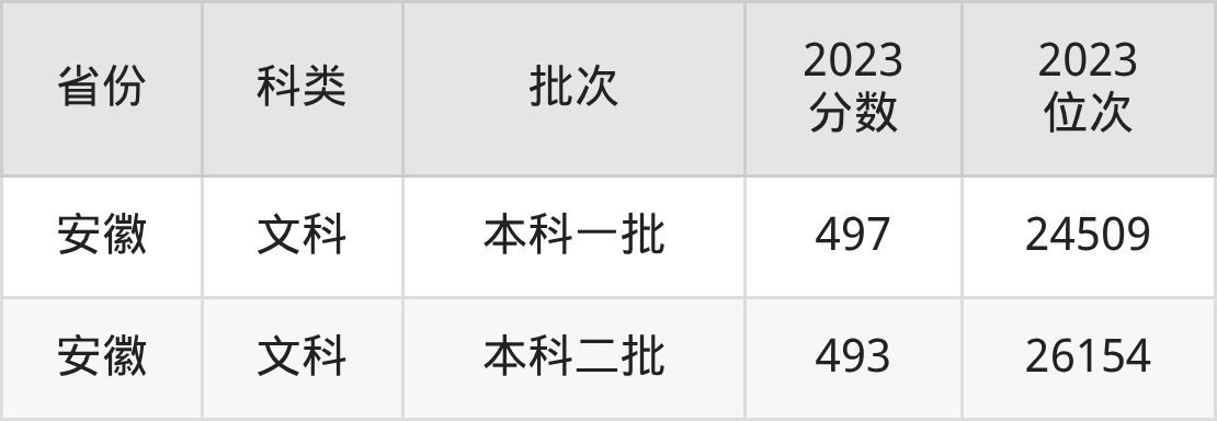 在文科方面,学校在安徽招收本科生。分数详情可直接见下表: