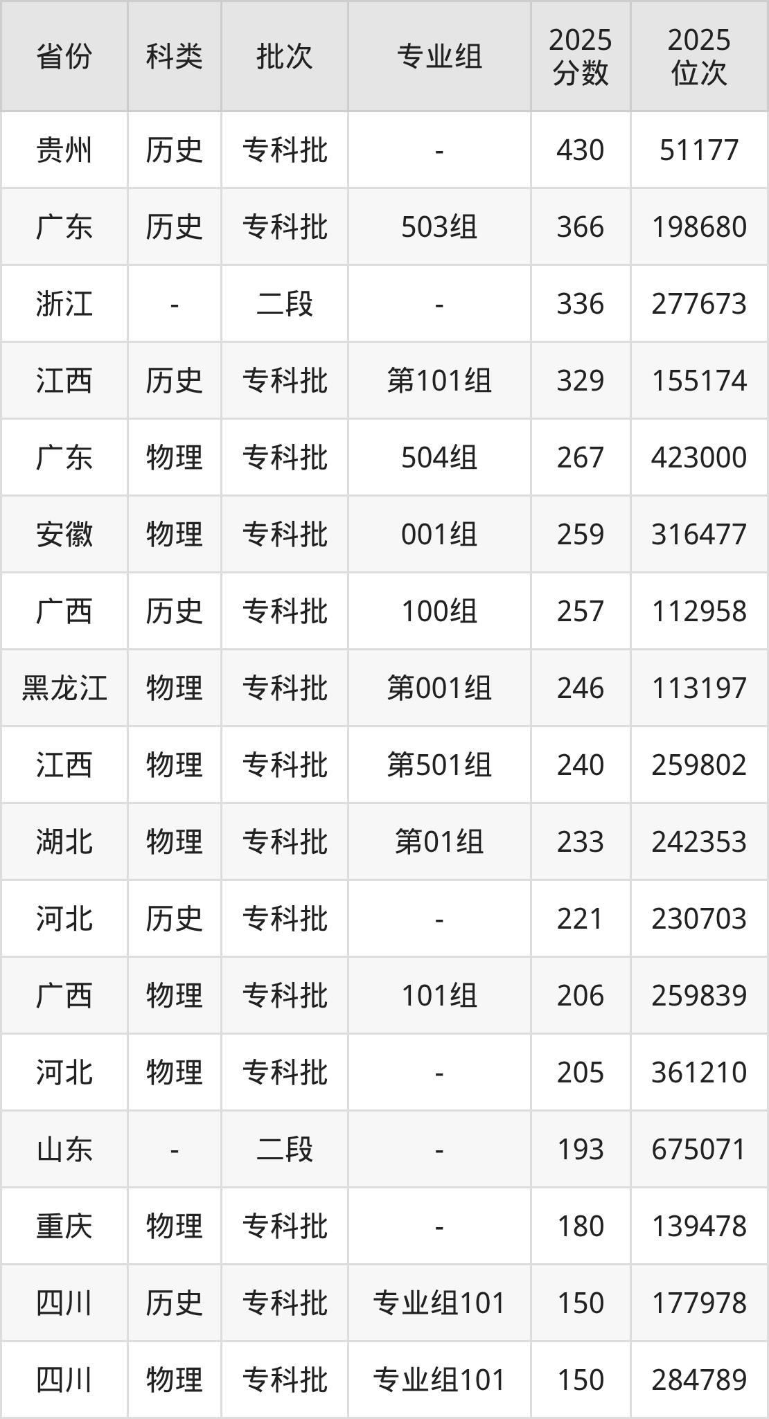 漳州科技职业学院在专科招生,现以学校2025年在江西物理类(专科)的录取情况为例,第501组最低分为240分。关于院校更多省市专科批分数线,详见下文。