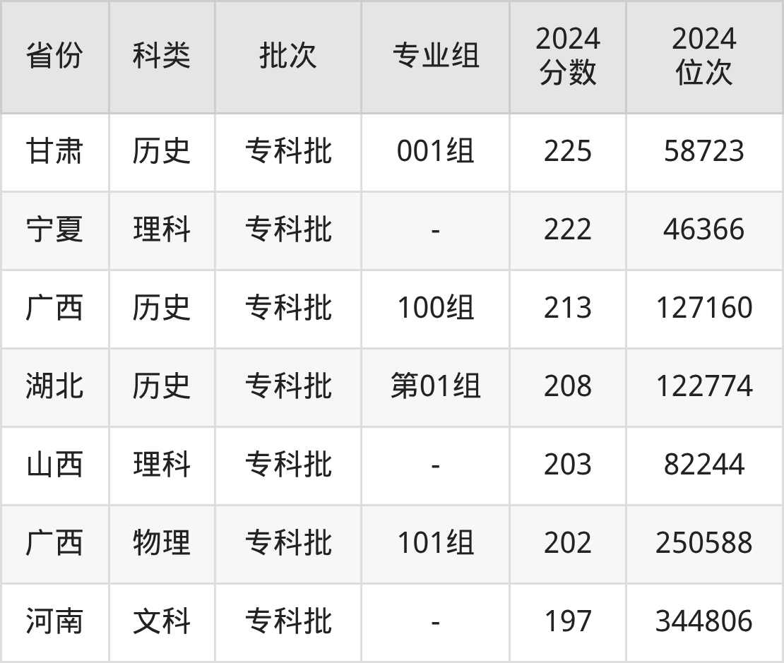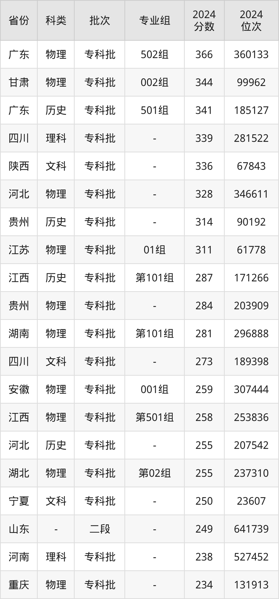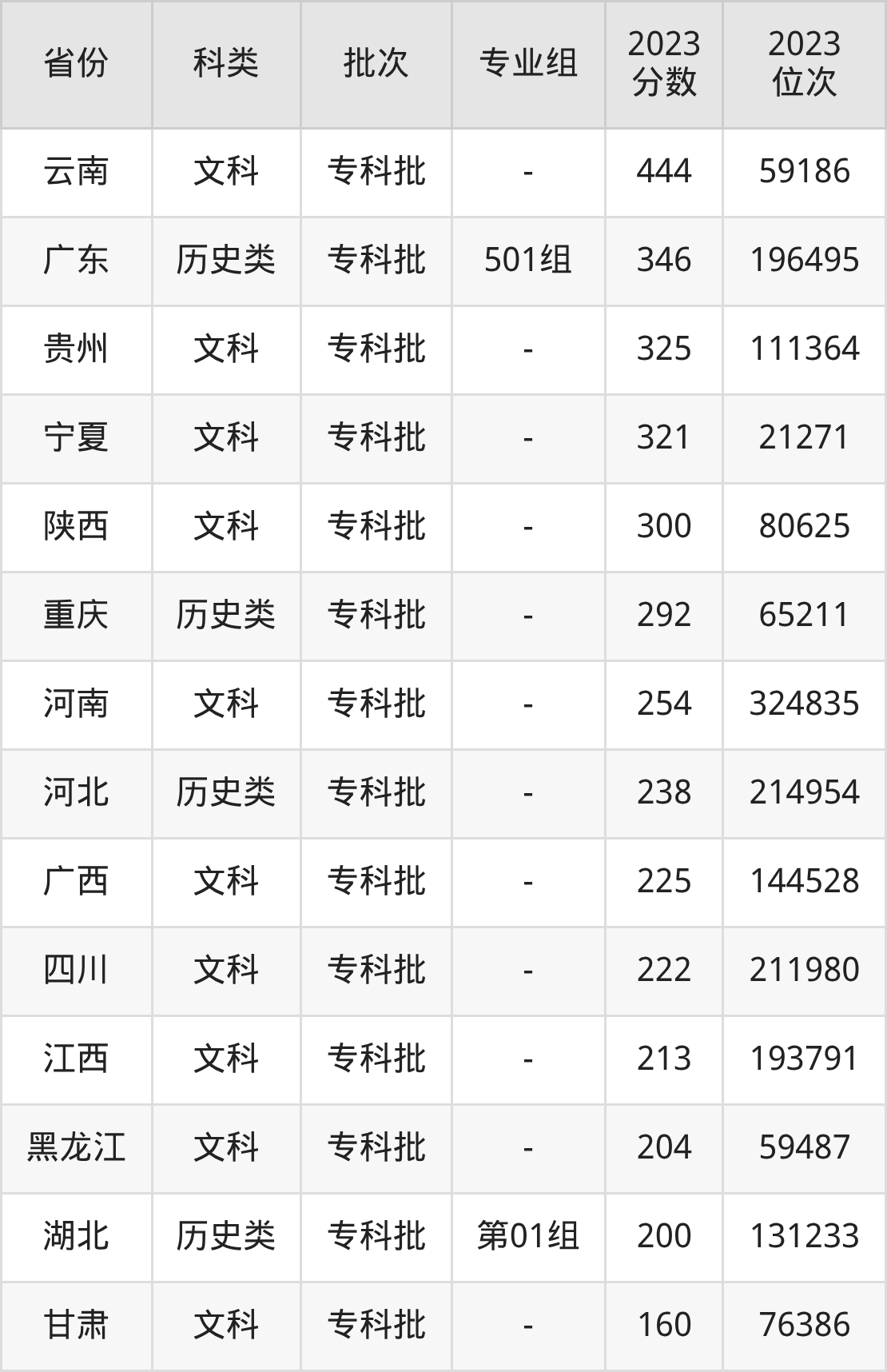 在文科/历史类方面,学校在云南、广东、贵州等地招收专科生。从下图可看到,学校在甘肃文科专科最低分要求比理科要高,差值为0分。分数详情可直接见下表: