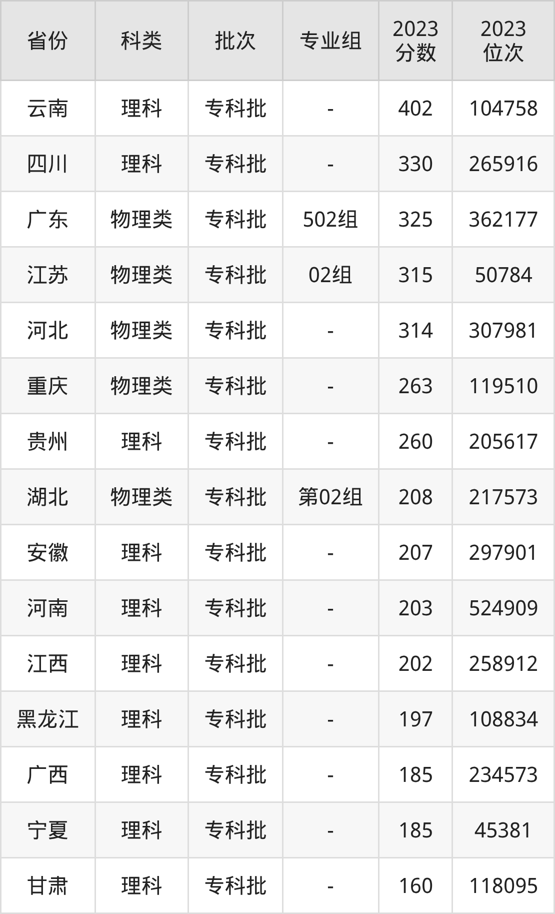 从学校专科专业在各省的录取线来看,云南、四川等地分数最好要超过专科线180分左右。下面是漳州科技职业学院2023年理科/物理类录取分数线一览表: