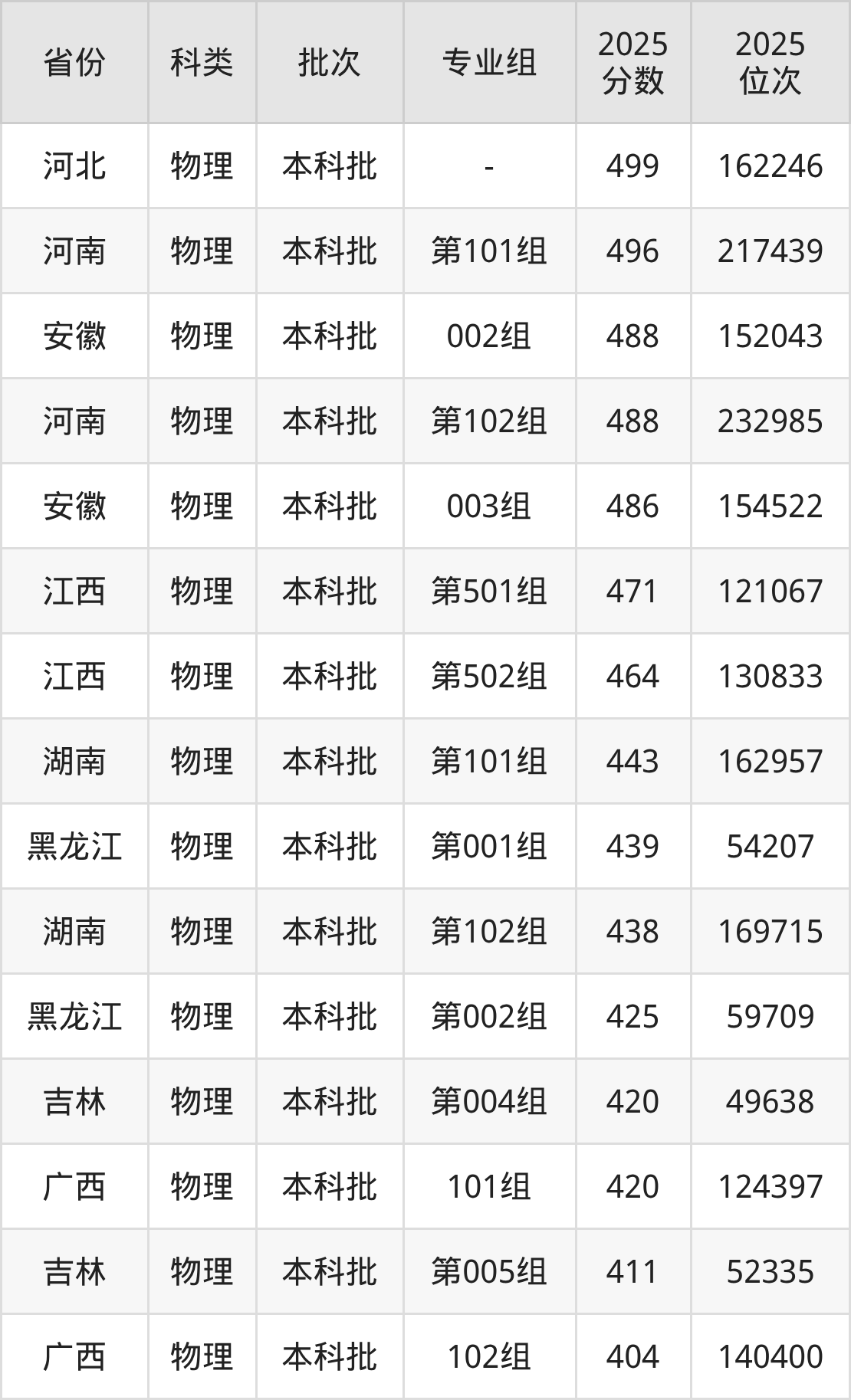 | 科类 | 专业组 | 2025 分数 | 2025 位次 |