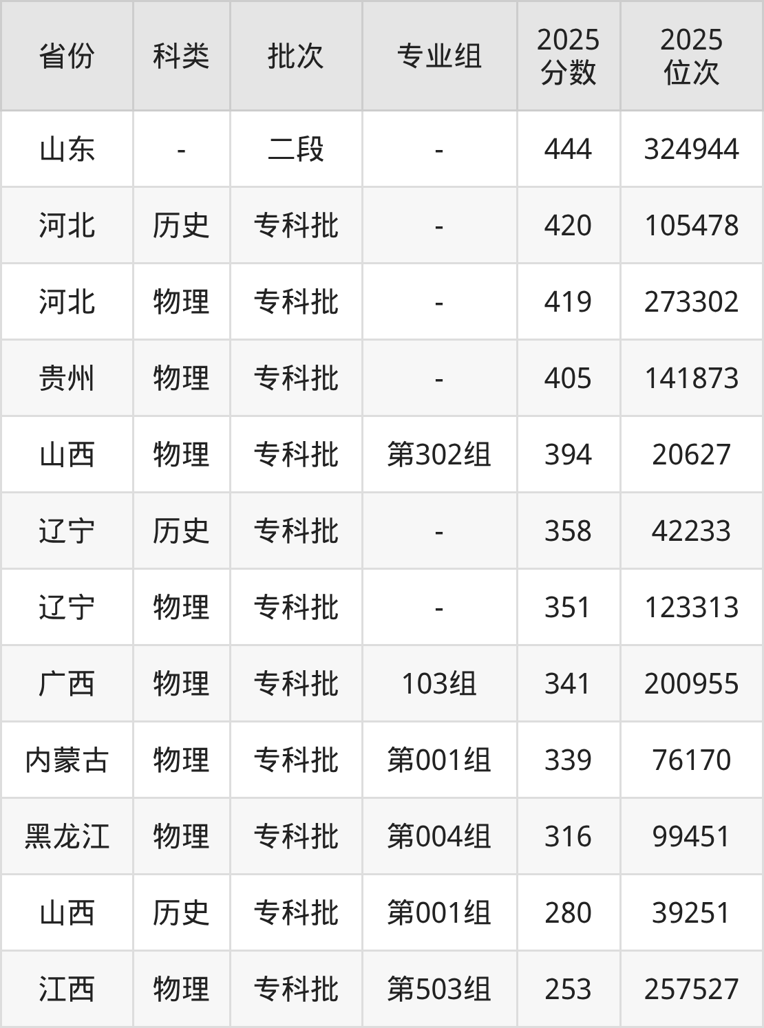 下面根据各省教育考试院公布的投档线信息汇总了长春职业技术大学2025录取分数线: