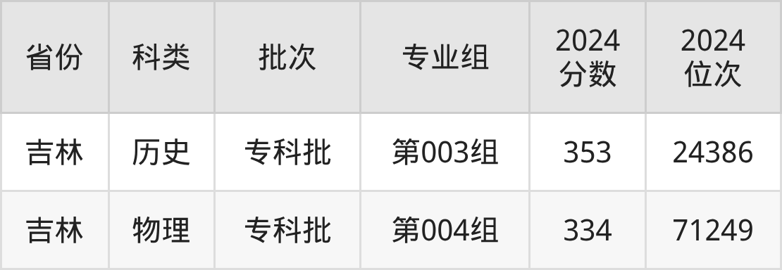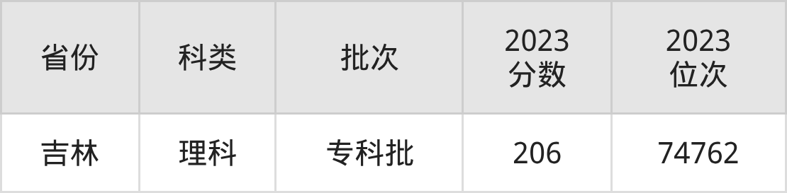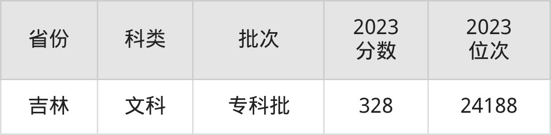 在文科方面,学校在吉林招收专科生。分数详情可直接见下表: