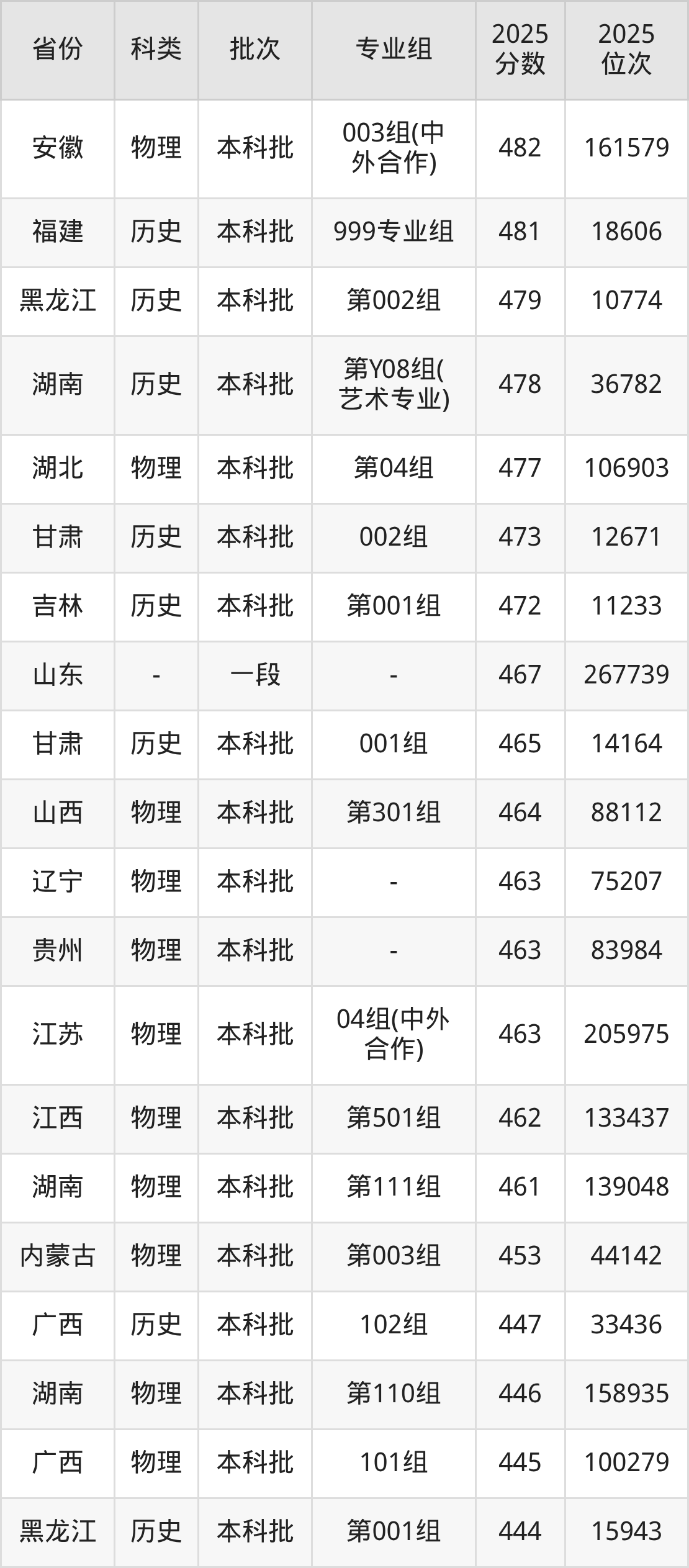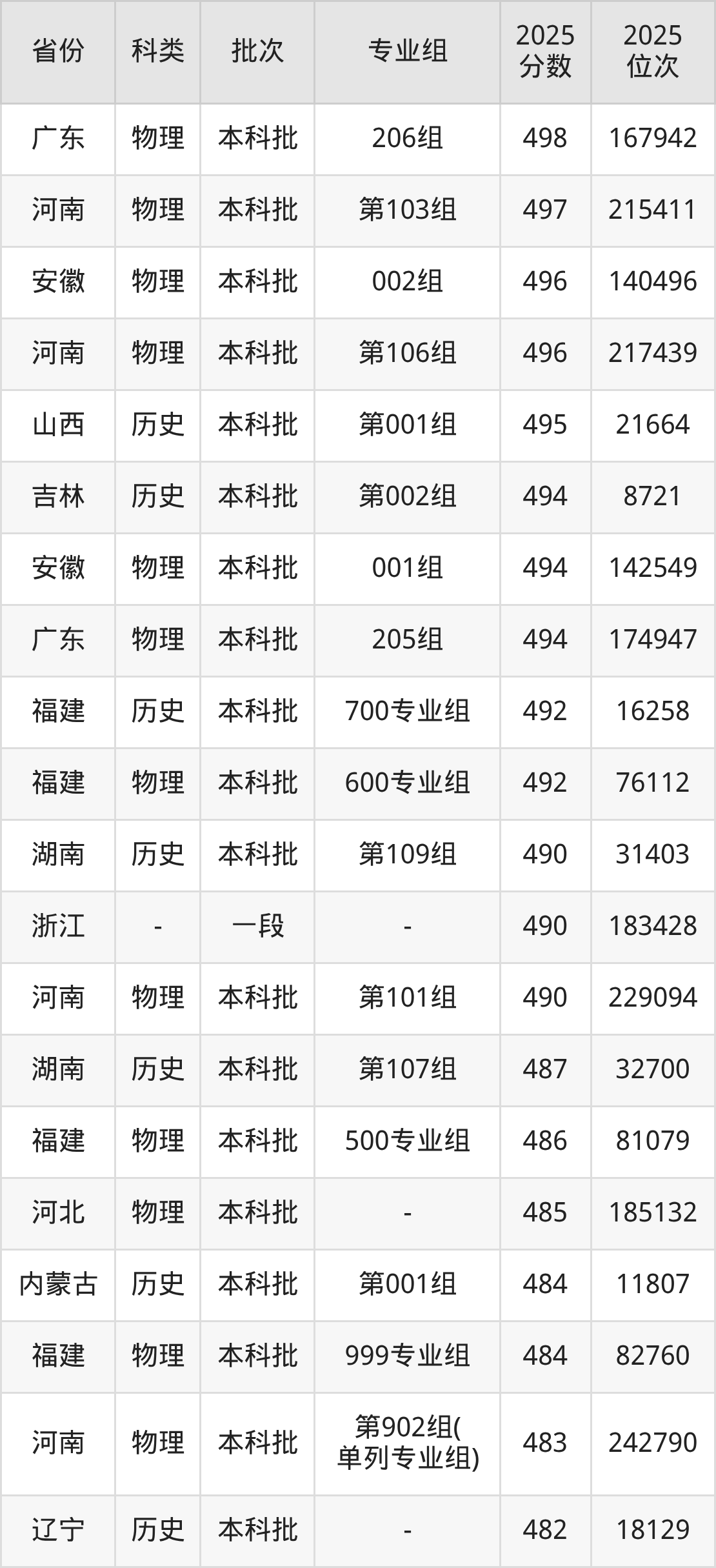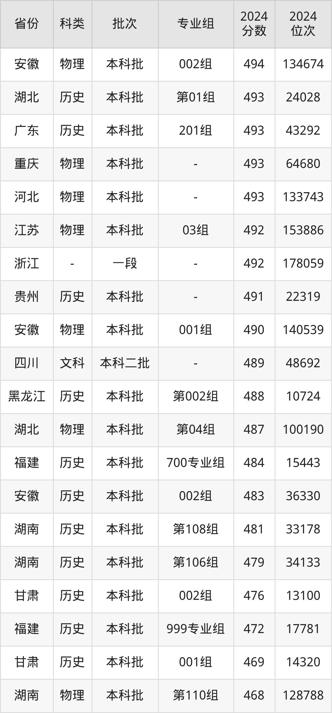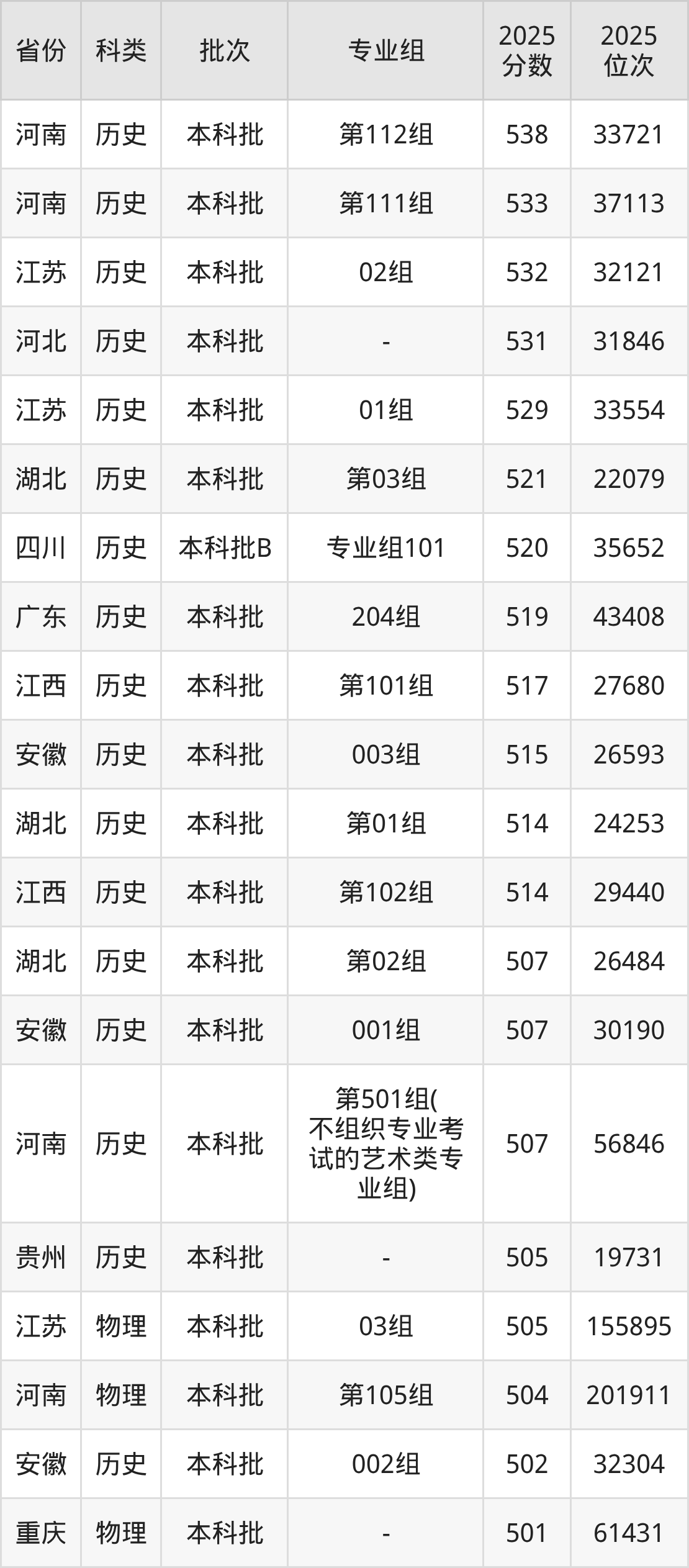 历史类201组:最低分为493分、位次是43292名