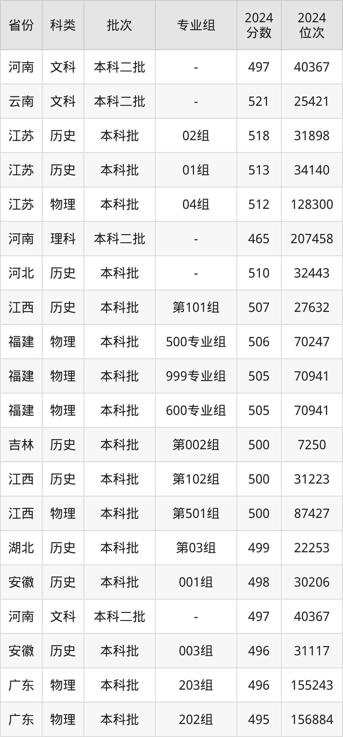 物理类203组:最低分为496分、位次是155243名