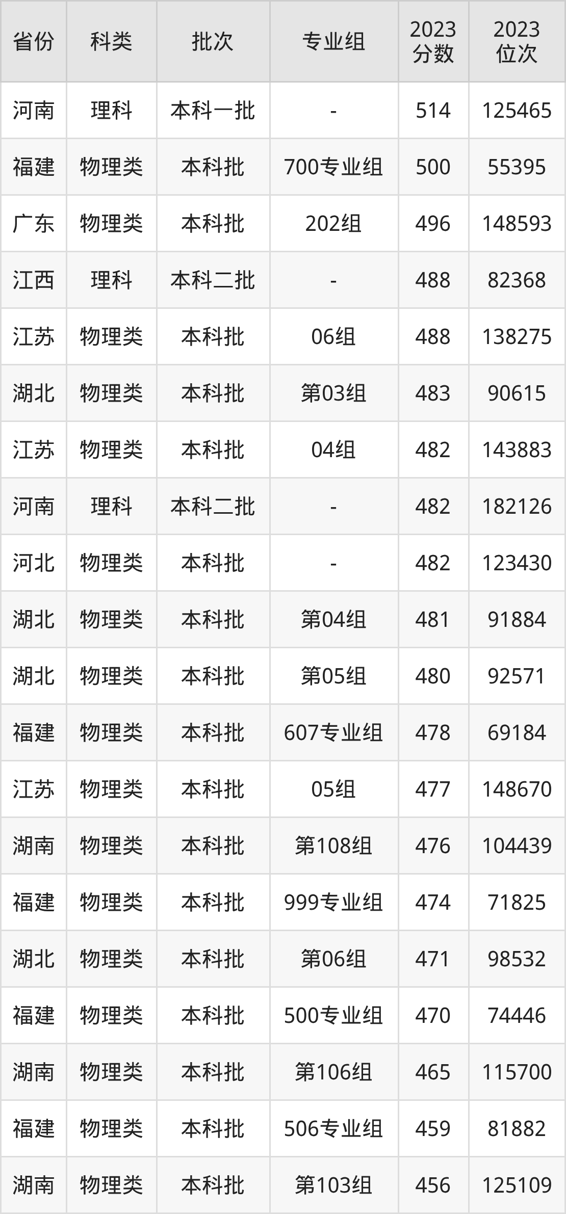 物理类:第902组(单列专业组)483分、第101组490分、第106组496分、第103组497分、第105组504分