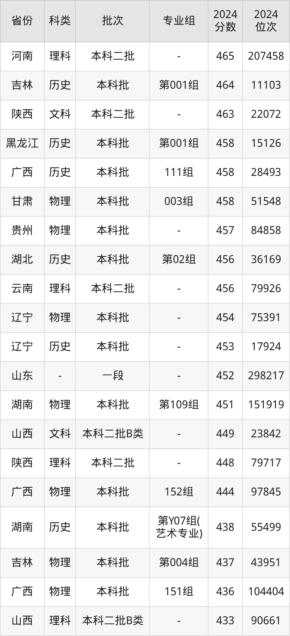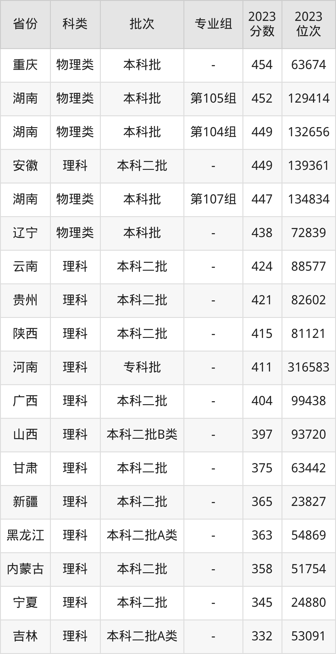 物理类151组:最低分为436分、位次是104404名