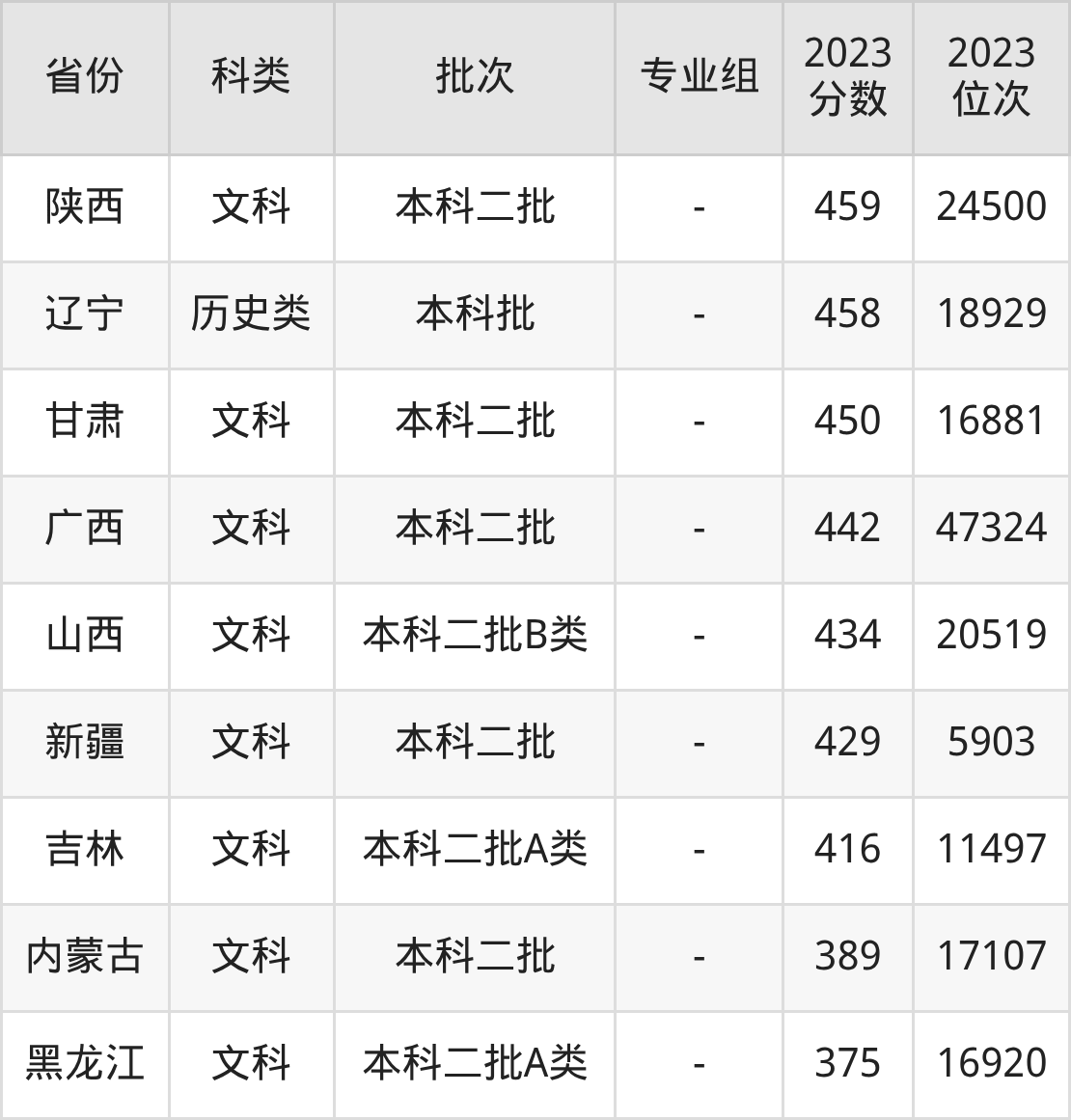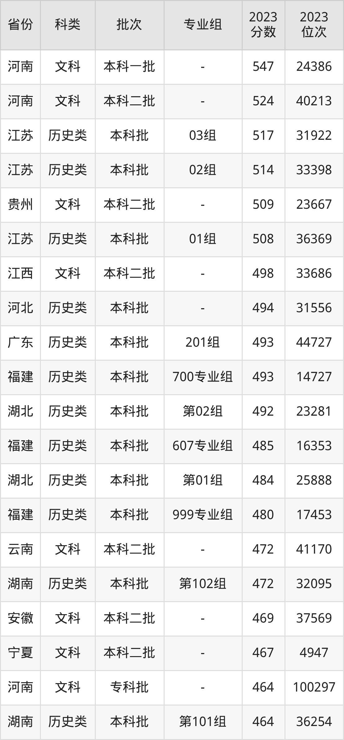 文科:最低分为449分、位次是23842名