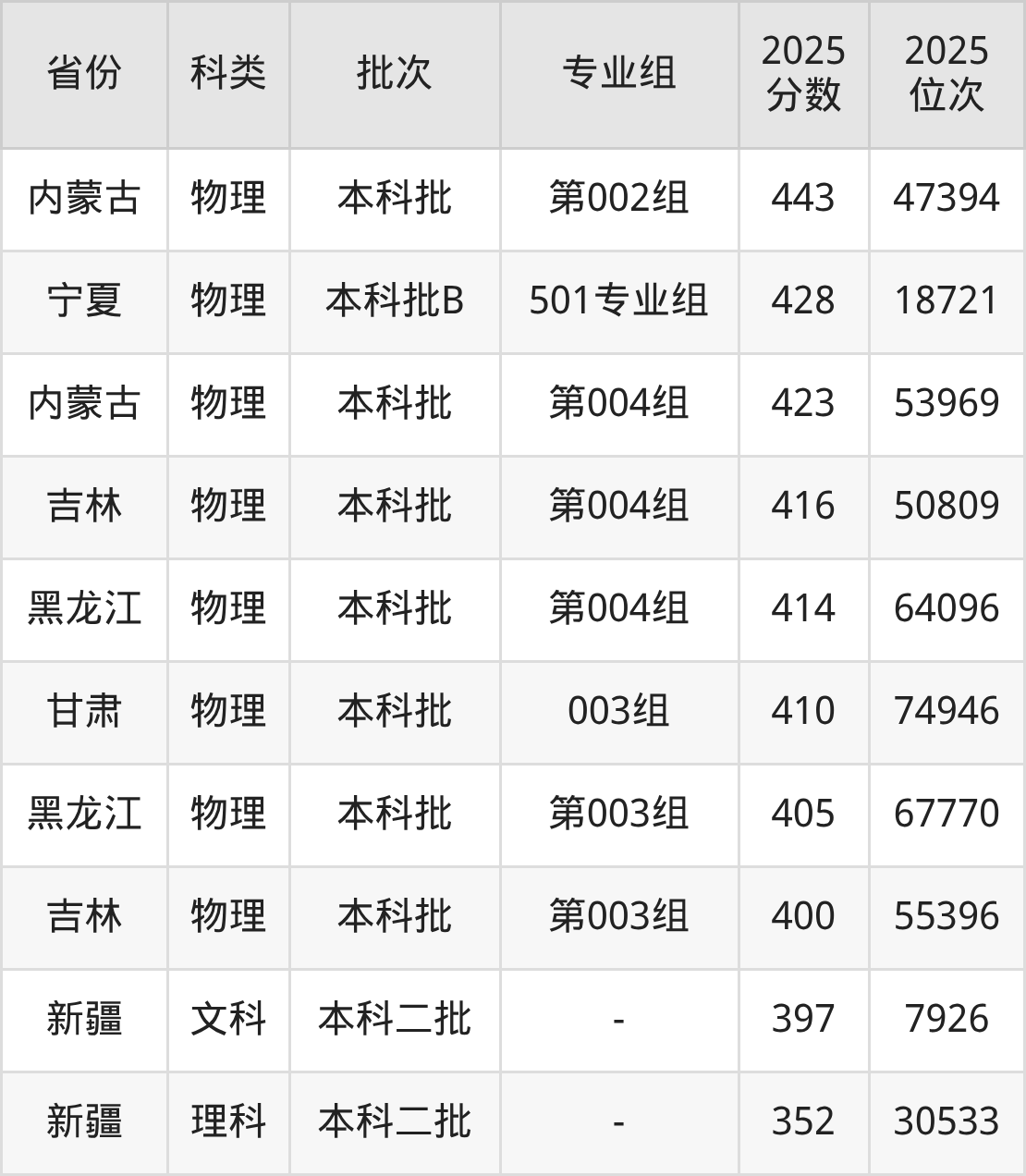物理类第003组:最低分为392分、位次是74166名