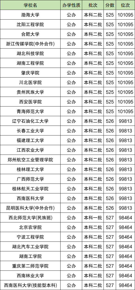 10万名左右最低位次对应的院校是渤海大学、沈阳工程学院、合肥大学,最低录取位次为101095位,位次对应分数为525分。