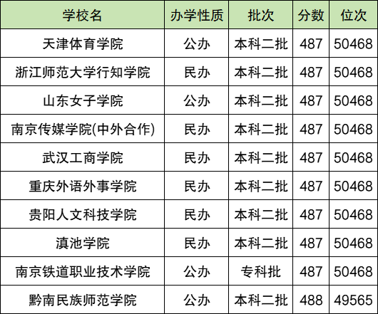 5万名左右最低位次对应的院校是天津体育学院、浙江师范大学行知学院、山东女子学院,最低录取位次为50468位,位次对应分数为487分。