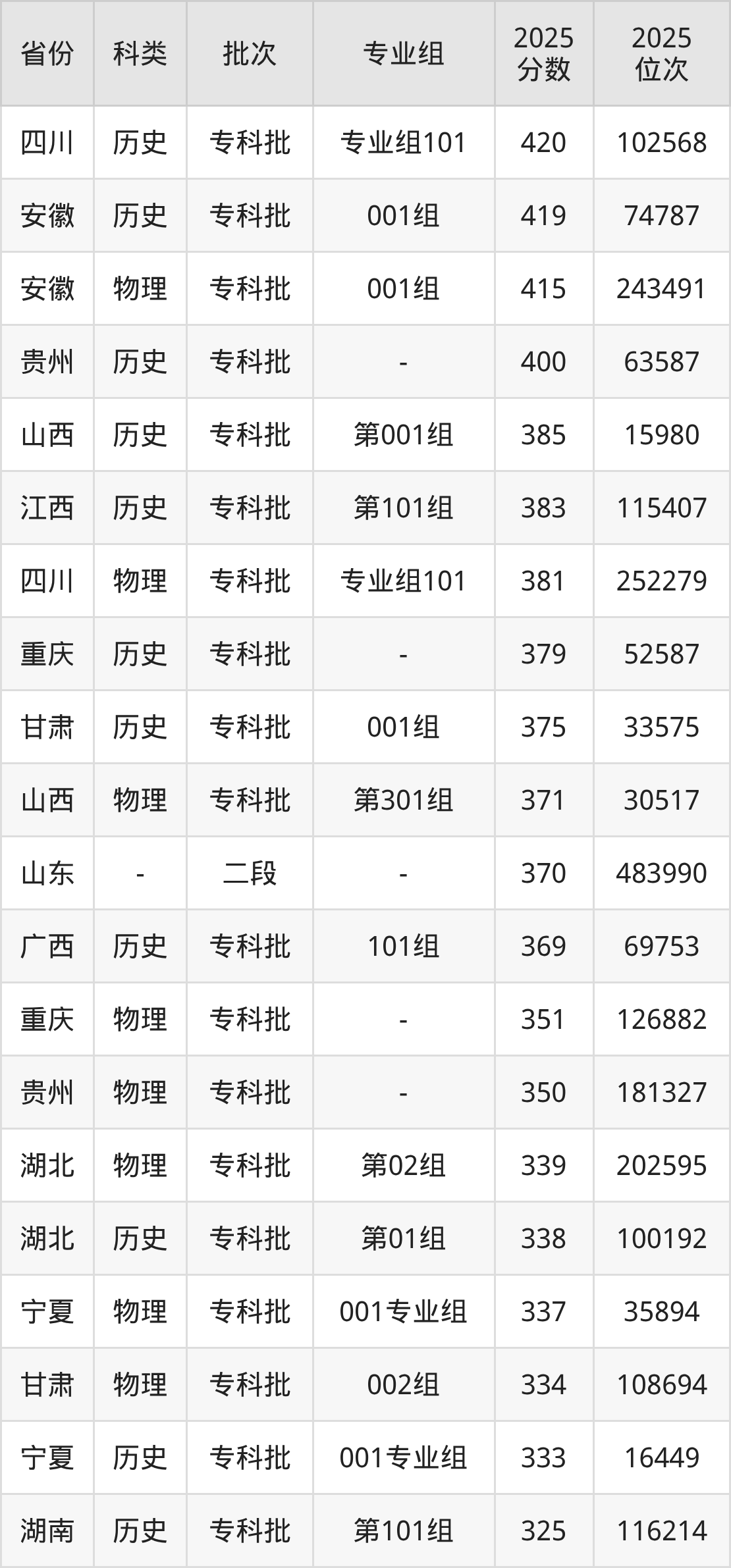 物理类最低分为385分,对应最低位次为304225名;历史类最低分为391分,对应最低位次为128342名。各分数及位次详情见下表: