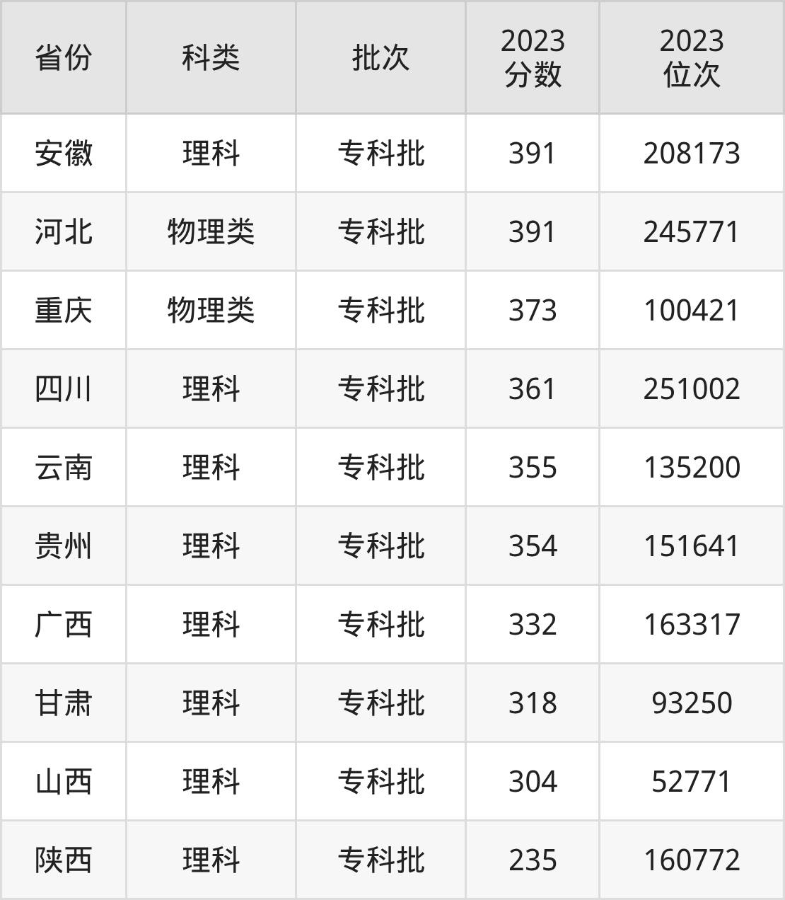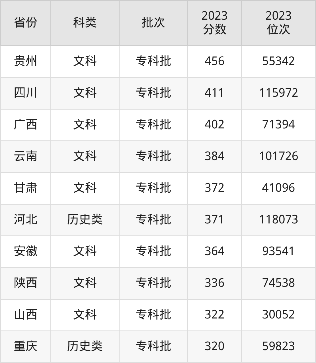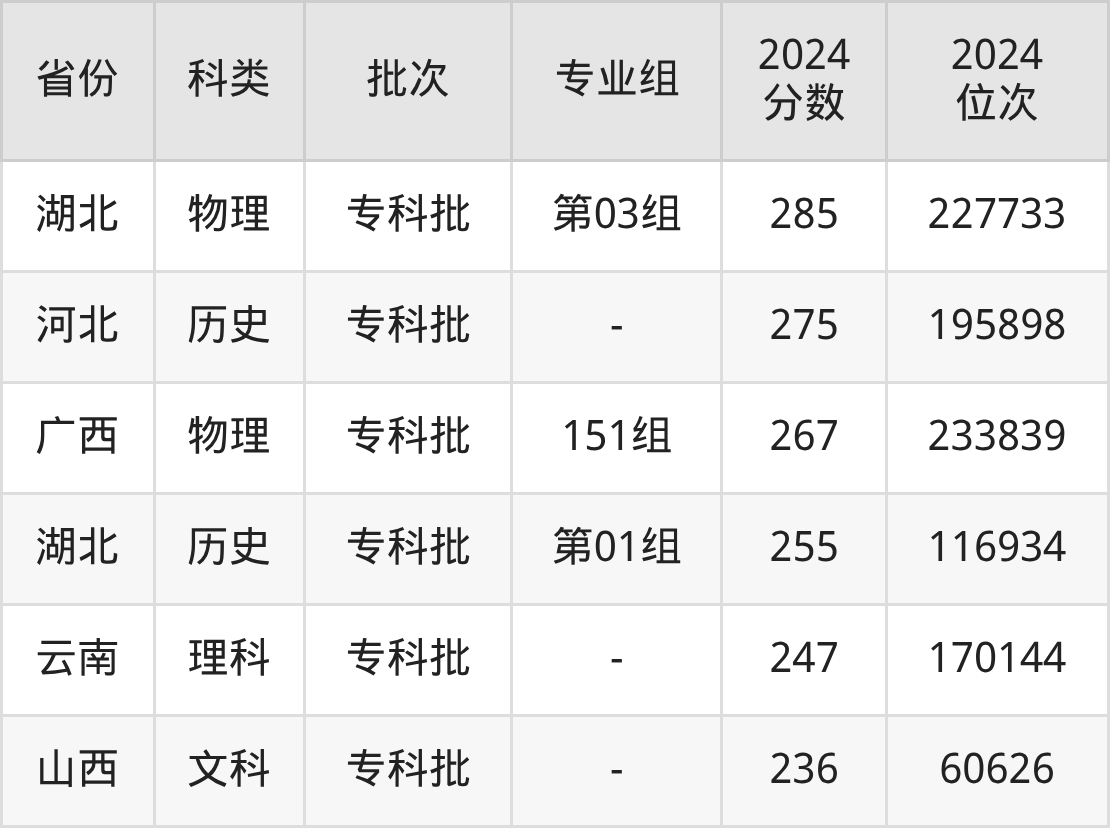 在文科/历史类方面,学校在贵州、四川、广西等地招收专科生。从下图可看到,学校在河北历史类专科最低分要求比物理类要低,差值为20分。分数详情可直接见下表: