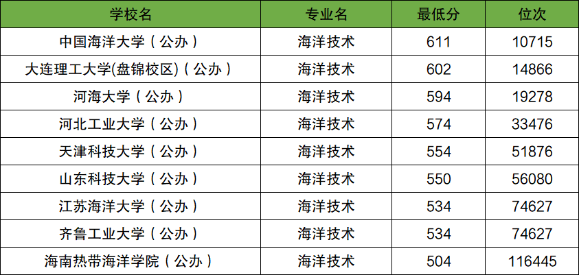 本科海洋技术院校分数线排名前五名:中国海洋大学611分、大连理工大学(盘锦校区)602分、河海大学594分、河北工业大学574分、天津科技大学554分。