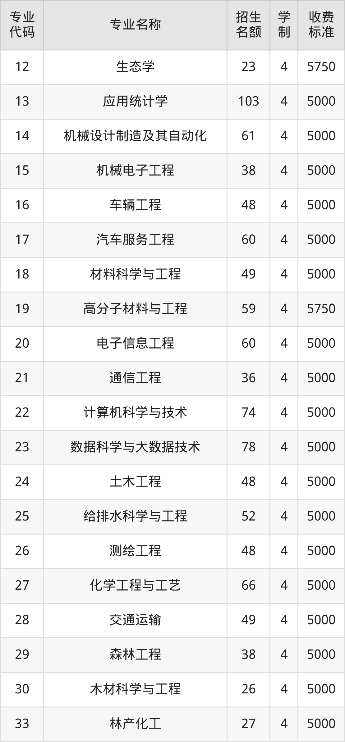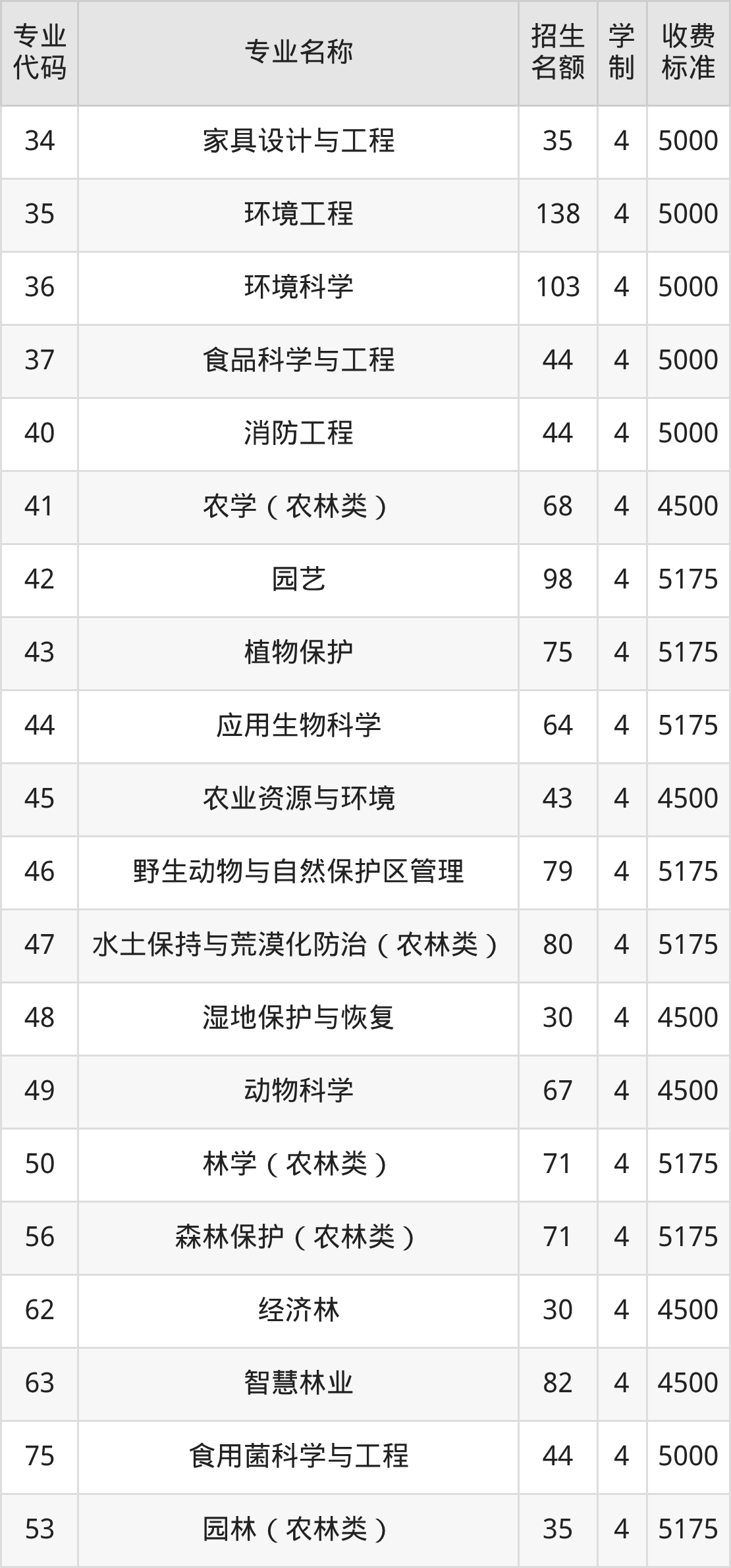 | 专业 代码 | 专业名称 | 招生 名额 | 学 制 | 收费 标准 |