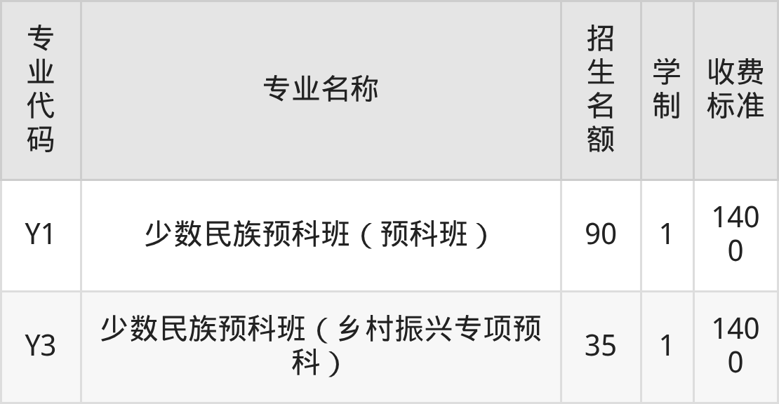 | Y4 | 少数民族预科班(乡村振兴专项预科) | 15 | 1 | 1400 |